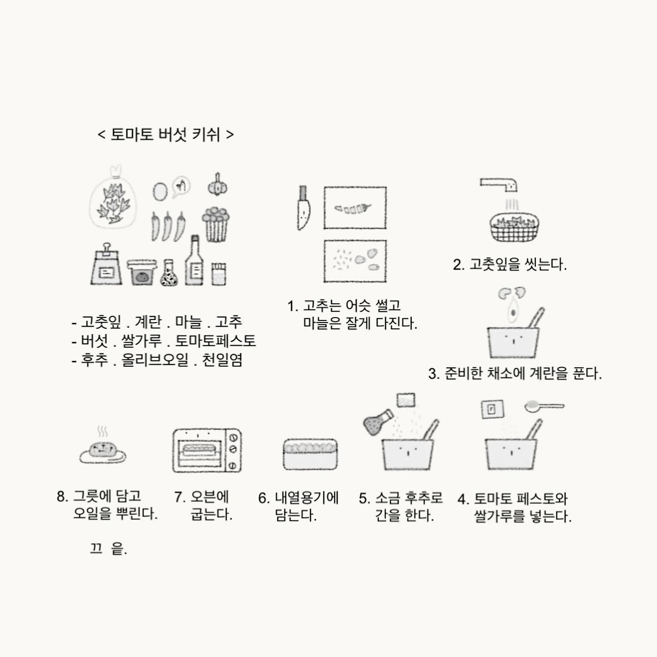 그래도 한 스푼 먹어보니 맛은 나름 괜찮았다. 계란을 넣었더니 에그타르트 맛도 나고, 토마토를 넣었더니 피자맛도 났다. 무엇보다도 푸짐하게 들어간 버섯과 마늘향이 마음에 들었다. 그렇게 내가 만든 첫 키쉬 아니 푸딩은 쌀가루와 계란양을 좀 더 수정하면 다음번엔 훨씬 나은 결과가 나올 거 같았다. 생전 처음으로 본 적 없는 음식을 만든다는 건 그런 것이었다. 첫 오류가 진화의 발판이 되길 바랄 뿐이었다. 몇 번 후에 완성될지는 몰라도 언젠가 나만의 채소 키쉬가 완성된다면 그땐 초를 꽂고 자축을 하고 싶다는 마음이 들었다.