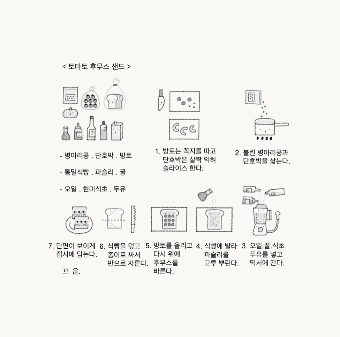 살아 생 전 후무스를 먹어본 적이 없다. 어디선가 병아리콩을 으깨면 굉장한 맛이 난다는 이야기를 주워듣고 즉흥적으로 시도해 본 것이다. 레몬즙은 현미식초로 큐민은 파슬리로 대체했다. 45번째 전생엔 고대 이집트 요리사였다고 믿고 있다. 기세로 밀어붙였다는 소리다. 당시의 맛을 완벽히 재현할 수 없지만, 진짜 후무스맛이 어떨진 모르지만 추억과 상상은 그 이상을 창조한다고 믿는다.
