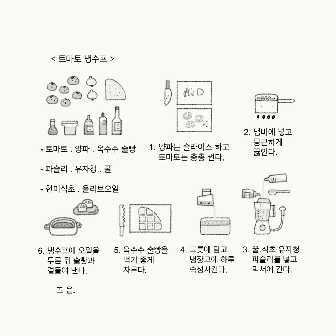 대서를 겨우 넘긴 불같은 날씨에 불 없는 요리가 성황 중이다. 오이를 수북이 올린 콩국수나 차가운 된장을 넣은 비빔밥이 토라진 입맛을 달래어준다. 냉장고 속 장기 체류 중인 토마토를 꺼내 수프를 만들었다. 반려인의 본가 텃밭에서 데려온 아이들로 모양도 크기도 제각각이라 사랑스럽기 그지없다. 달큼한 햇양파도 한 주먹 넣고, 새콤한 유자청도 한 스푼 넣고, 껍질채 믹서에 넣고 돌돌돌 갈아 만들었다. 그렇게 통에 담아서 냉장고에 하루 숙성 시키니 풍미가 한결 깊어졌다. 기다리는 마음도 비법 중 하나라는 걸 배운다.