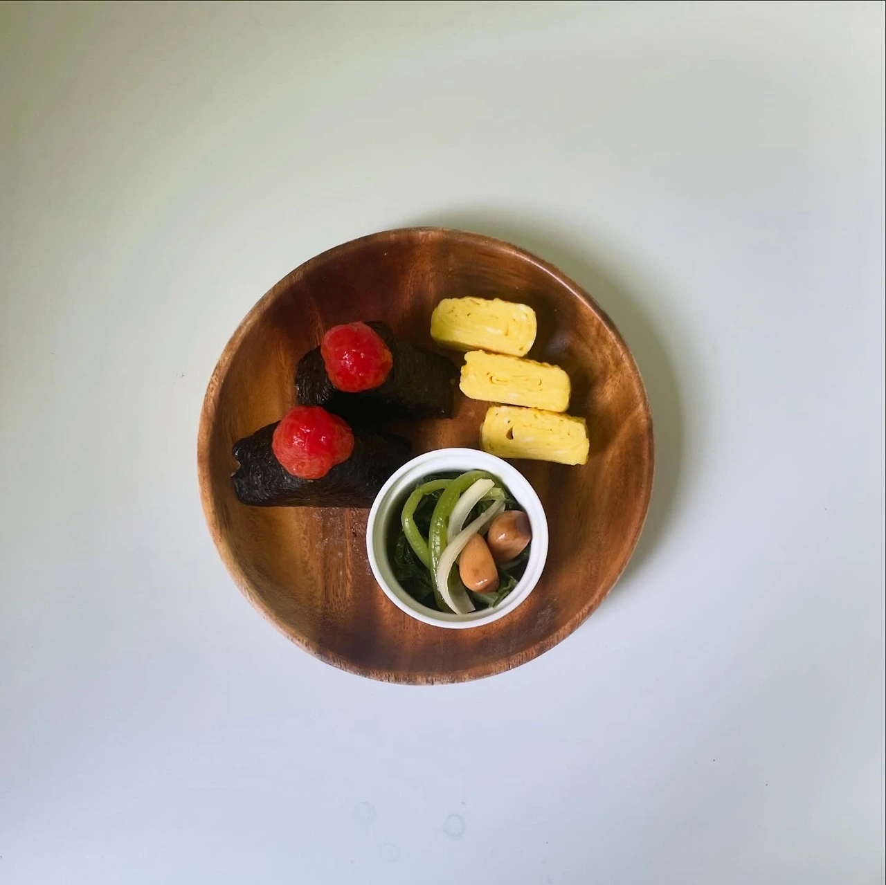 이른 가을 소풍을 상상하며 주먹밥을 만들었다. 잔잔한 일본 영화 속 한 장면처럼 소박하고 단아한 한 끼를 먹고 싶었다. 주먹밥 하면 우메보시지만 우리 집엔 그런 거 없으니 방울토마토 조림으로 대체했다. 방울토마토는 익혀 껍질을 벗긴 후 오일, 간장, 매실액으로 졸여 만든다. 버섯은 잘게 다져 볶은 뒤 잡곡밥과 섞어 소금과 참기름으로 간한다. 삼각틀에 넣고 손으로 꼭꼭 누른 뒤, 밥 알이 잘 뭉쳐졌으면 틀에서 꺼낸다. 김으로 감싸고 그 위에 에 방토조림을 올리면 끝. 마치 산 꼭대기에 해가 걸린 거처럼 귀여운 모양이 된다.