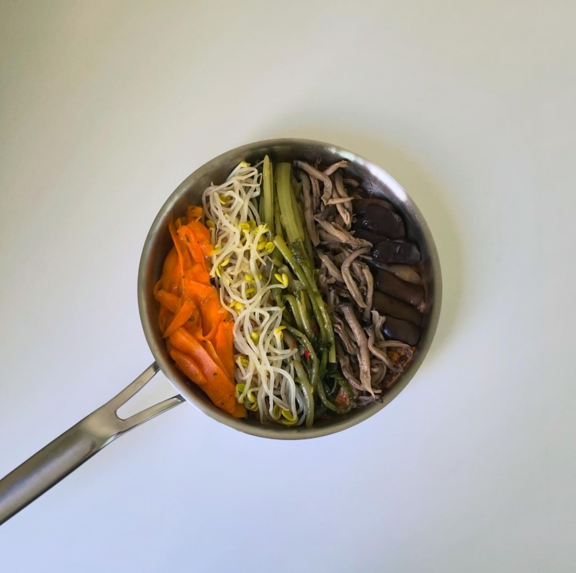 요즘 서진이네를 시청하며 주야장천 비빔밥만 먹고 있다. 이참에 근사한 뚝배기를 살까도 생각했지만 또 막상 사려니 고민이 된다. 보기보다 무겁기도 하고, 와플팬처럼 한 때 잠시 쓸 거 같다는 생각도 들고, 무엇보다도 종류가 너무 많아 고르다 지쳐버렸다. 다행히 뚝배기가 없어도 비빔밥은 가능하니 현재는 우리 집 만능 팬을 이용하고 있다. 된장에 졸여서 으깬 두부와 밥을 섞어 깔고, 그 위에 준비한 콩나물, 가지, 버섯, 당근, 열무를 일열로 올리면 끝. 된장이 간이 충분해 가지와 버섯만 간장으로 버무려 주었다. 이 주째 먹고 있는데 이번주도 질리지 않으면 진심 인생 뚝배기를 고려해 봐야겠다. 지금 마음이라면 비빔밥은 평생 먹을 수 있지 않을까 싶다.