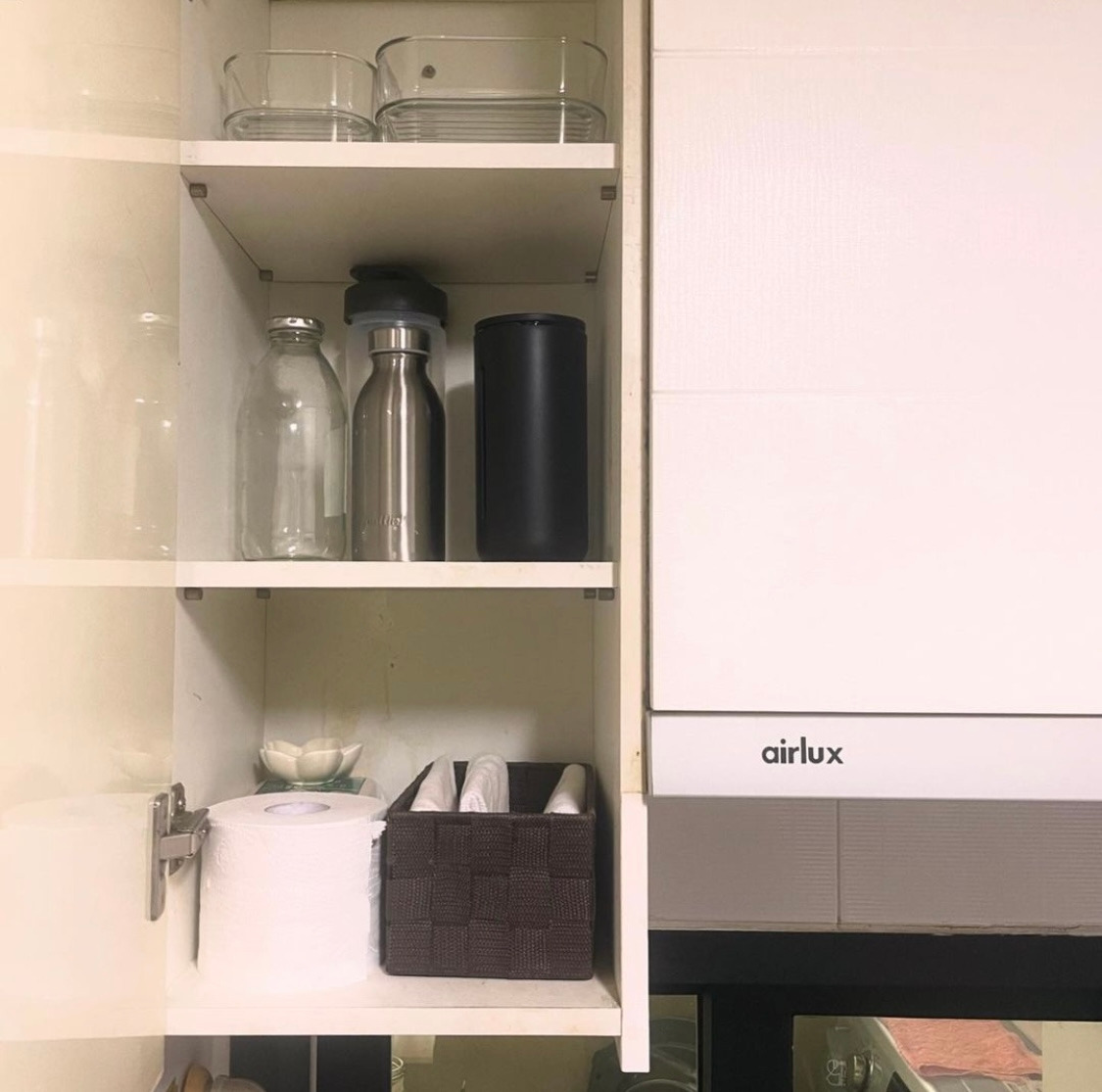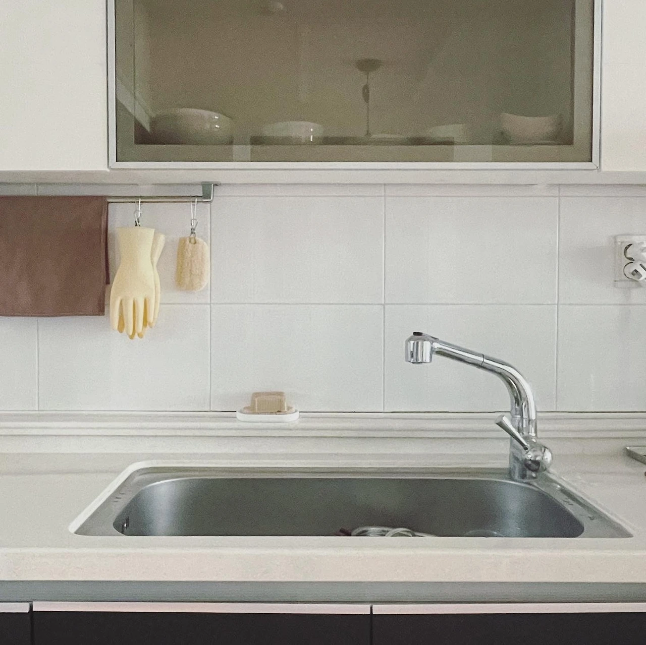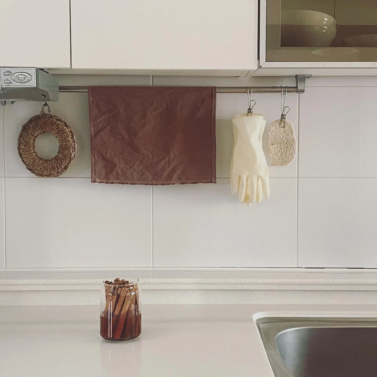 주방 여기저기에 물건을 잘 올려두지 않는다. 도마며 냄비며 필요할 때 수납장에서 꺼내 쓰고, 사용하면 바로 정리한다. 정수기 위쪽 선반엔 컵이, 아래엔 전기밥솥과 믹서기가 있다. 싱크대 쪽으론 그릇들이, 그 아래엔 재사용 비닐과 천연세제, 쓰레기통이 있다. 가스레인지와 작업대 주변으론 팬과 냄비, 조리도구, 조미료와 밀폐용기, 행주가 있다. 낭비 없고 효율적인 쓰임을 위해 모든 도구는 최소 수량으로 최적 동선에 자리 잡는다.