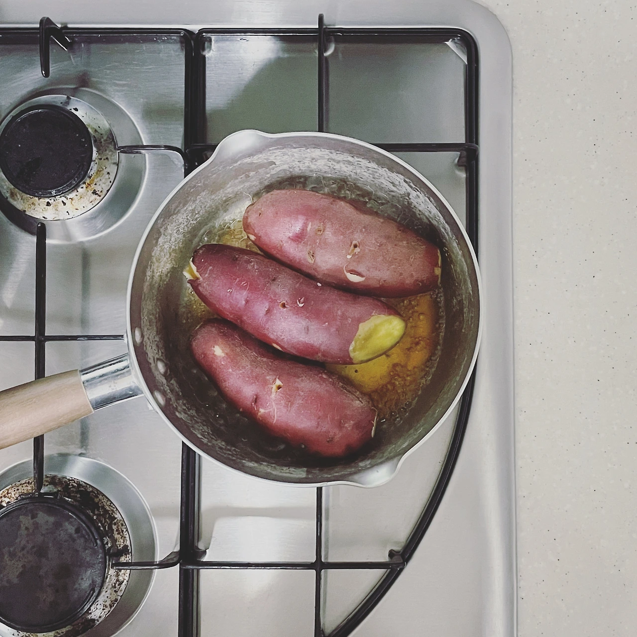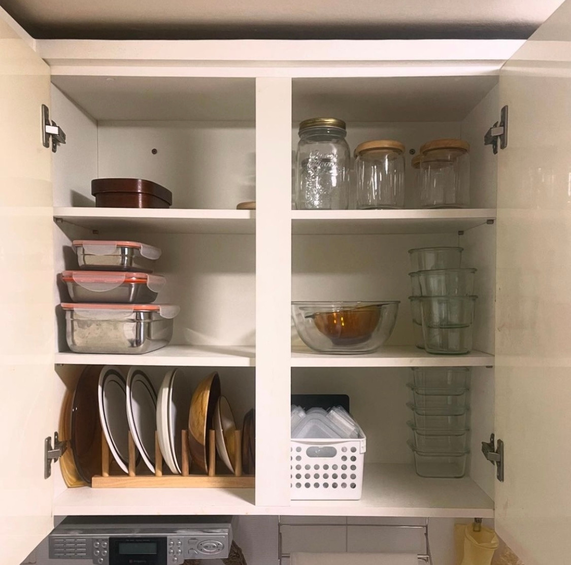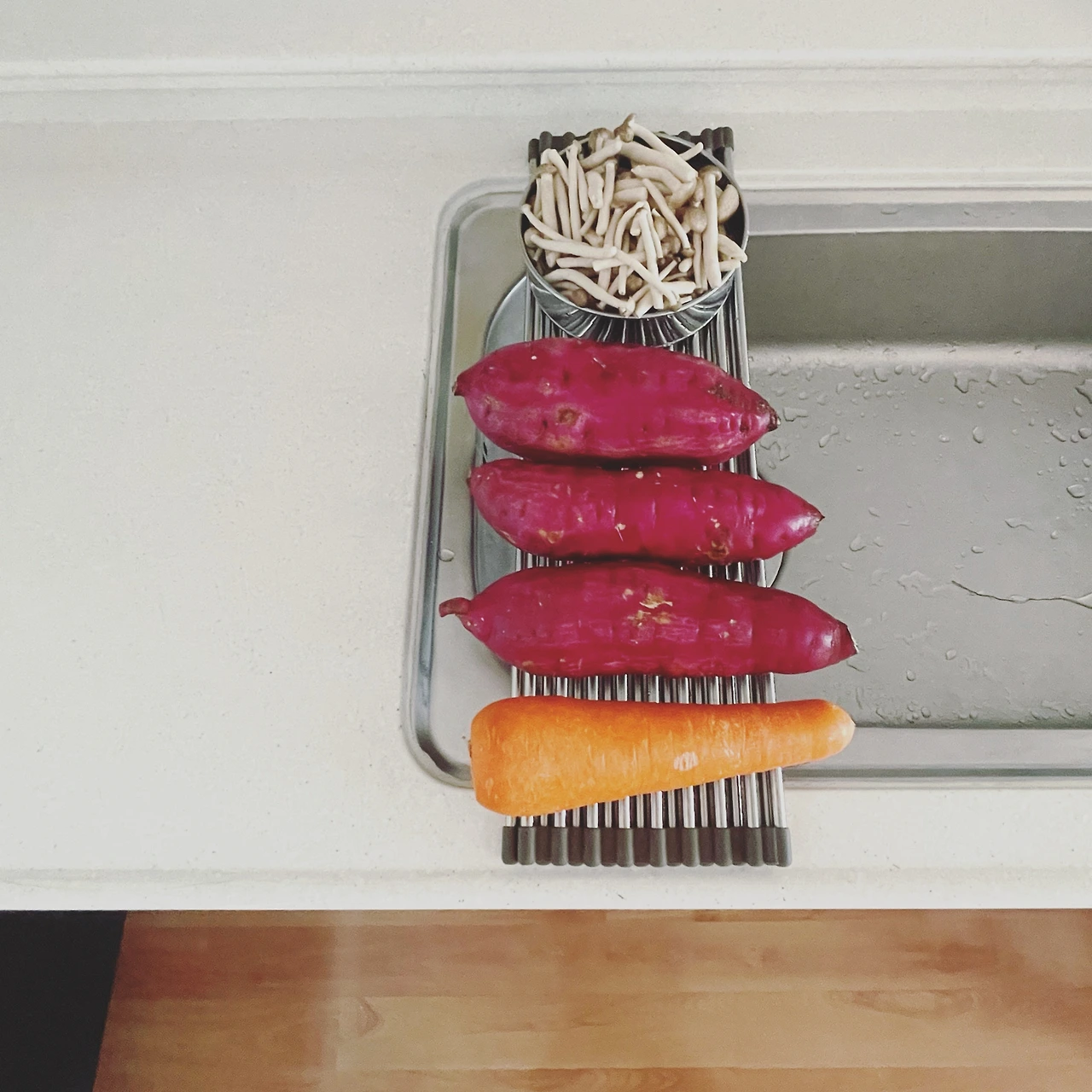 주방 여기저기에 물건을 잘 올려두지 않는다. 도마며 냄비며 필요할 때 수납장에서 꺼내 쓰고, 사용하면 바로 정리한다. 정수기 위쪽 선반엔 컵이, 아래엔 전기밥솥과 믹서기가 있다. 싱크대 쪽으론 그릇들이, 그 아래엔 재사용 비닐과 천연세제, 쓰레기통이 있다. 가스레인지와 작업대 주변으론 팬과 냄비, 조리도구, 조미료와 밀폐용기, 행주가 있다. 낭비 없고 효율적인 쓰임을 위해 모든 도구는 최소 수량으로 최적 동선에 자리 잡는다.