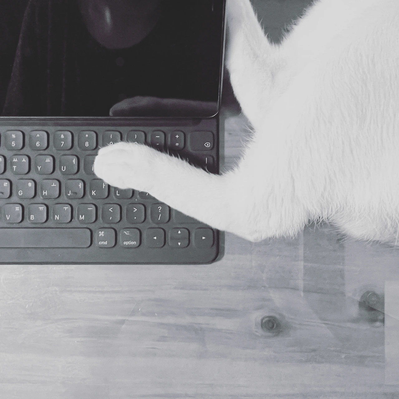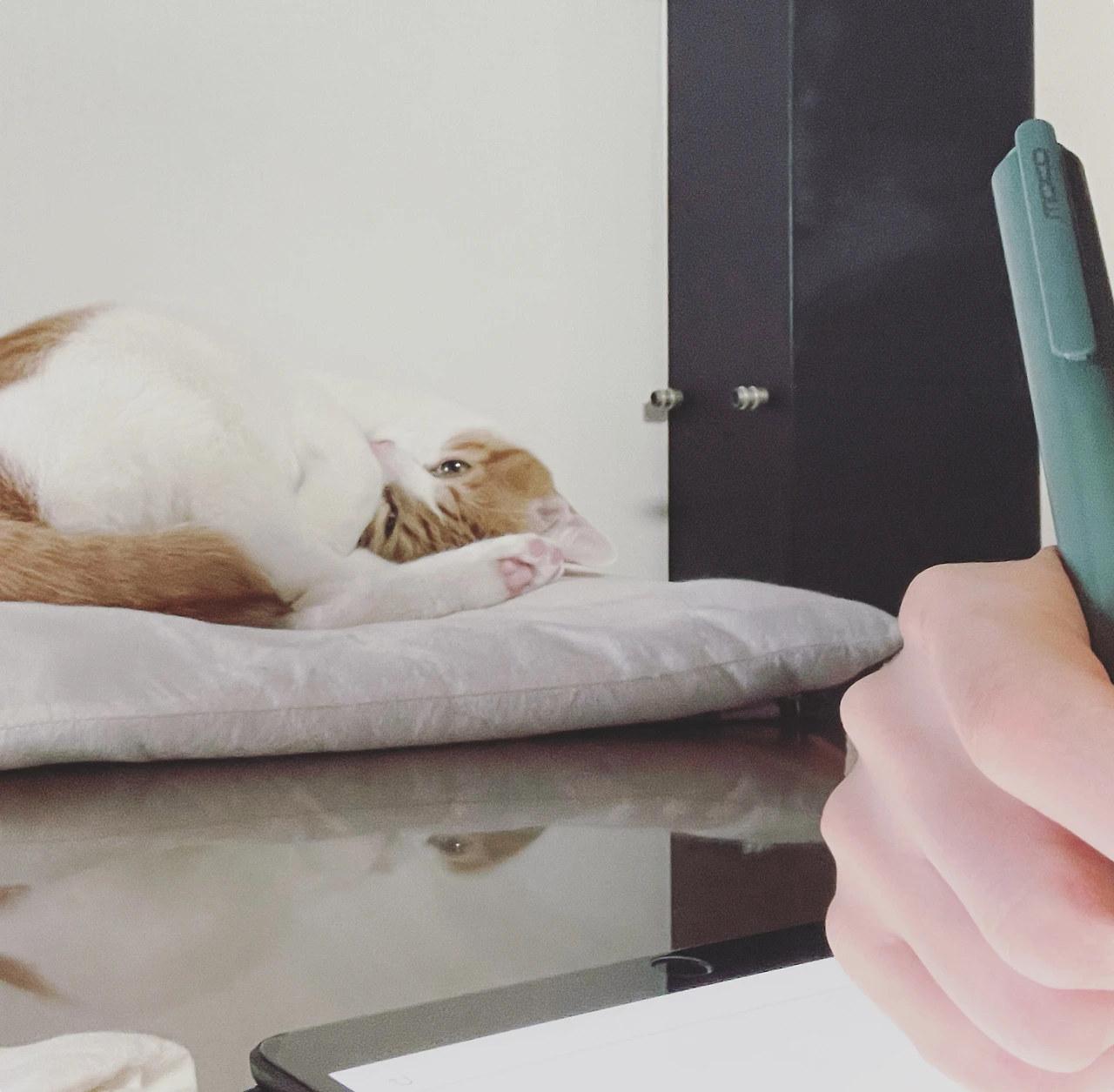 반대편 벽 쪽으로 식탁이 놓여있다. 이곳에서 밥도 먹고 작업도 하고 쉬기도 하며 하루 중 가장 많은 시간을 보낸다. 거실을 바라보는 쪽에 의자 하나만 있고, 반려인과 식사를 할 땐 작은방 의자를 하나 더 가져온다. 그 위에는 매일 먹는 약상자와 냥이들의 사료통만 있다. 10년 전 결혼할 때 구입한 원목 테이블라 수시로 다리가 삐꺽거려 종종 육각랜치로 조여주어야 한다.