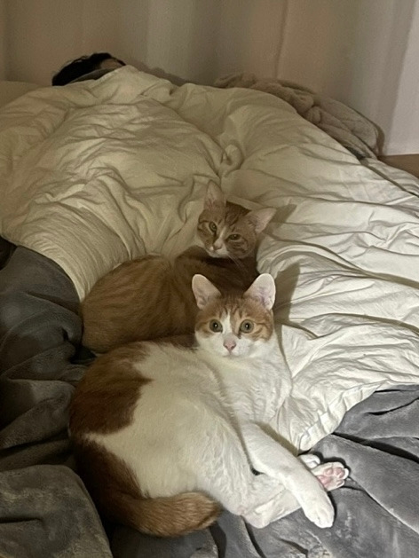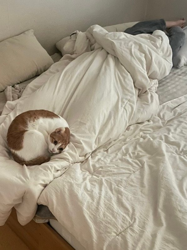 - 주말 아침 화장실을 다녀온 반려인이 사진을 보내왔다. 자고 있는 내 가랑이 사이에 두 냥이들이 둥지를 틀고 있는 모습이었다. 예전엔 그럴 때마다 허벅지가 참 따뜻했는데… 요즘은 다리가 저려 주리 트는 기분이다. 그래도 다 컸다고 곁은 주지 않는 것보다 마음은 편하다. 업이라면 업이지만 복이라고 생각하면 또 복이 되겠지 싶다.