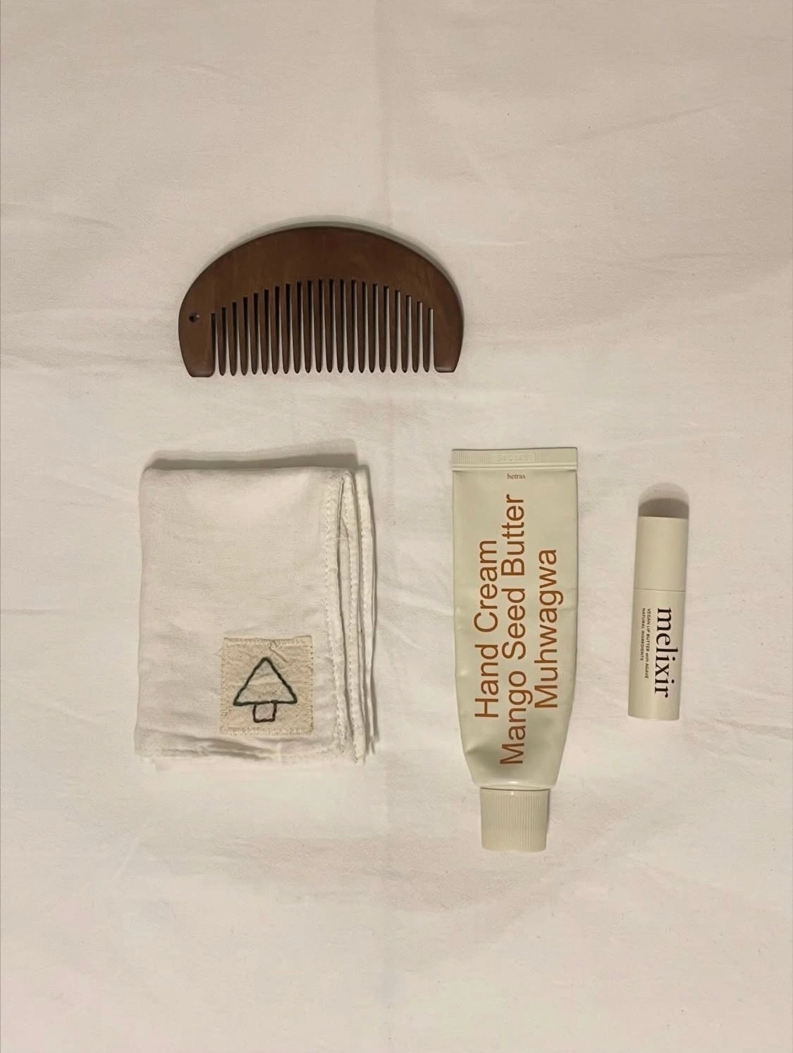 처음 한동안은 근사한 손수건을 찾아 헤매었다. 적당한 크기에 보드라운 재질, 흡수력, 세탁 용이성, 가격, 브랜드까지. 점점 따져볼 조건이 늘어났다. 손수건 하나 사는 데 명함이라도 맞추듯 신중의 신중을 기했다. 그럼에도 채워지지 않는 욕심과 예상치 못한 분실로 과한 자의식의 수정을 거쳤다. 결국 나의 취향은 기능을 대변하는 미로 옮겨갔다. 그렇게 돌고 돌아 지금의 자가 생산 단계에 이르렀다. 현재 최종 버전의 손수건은 소창 원단으로 만든 심플한 쌈지 손수건이다. 재질이 순하고 흡수성이 뛰어나 아기 기저귀로도 쓰이는 순면 천연 원단으로 만들었다. 평소 외출 후 샤워 전 가볍게 손빨래해 자연 건조로 말려 사용한다. 펼치면 손바닥보다 조금 큰 사이즈이고, 주머니 형태라는 점이 이 손수건의 킬포이다. 급하게 비닐이 필요한 순간 힙하게 꺼내 과일이나 소품들도 담을 수 있도록 설계되었다.