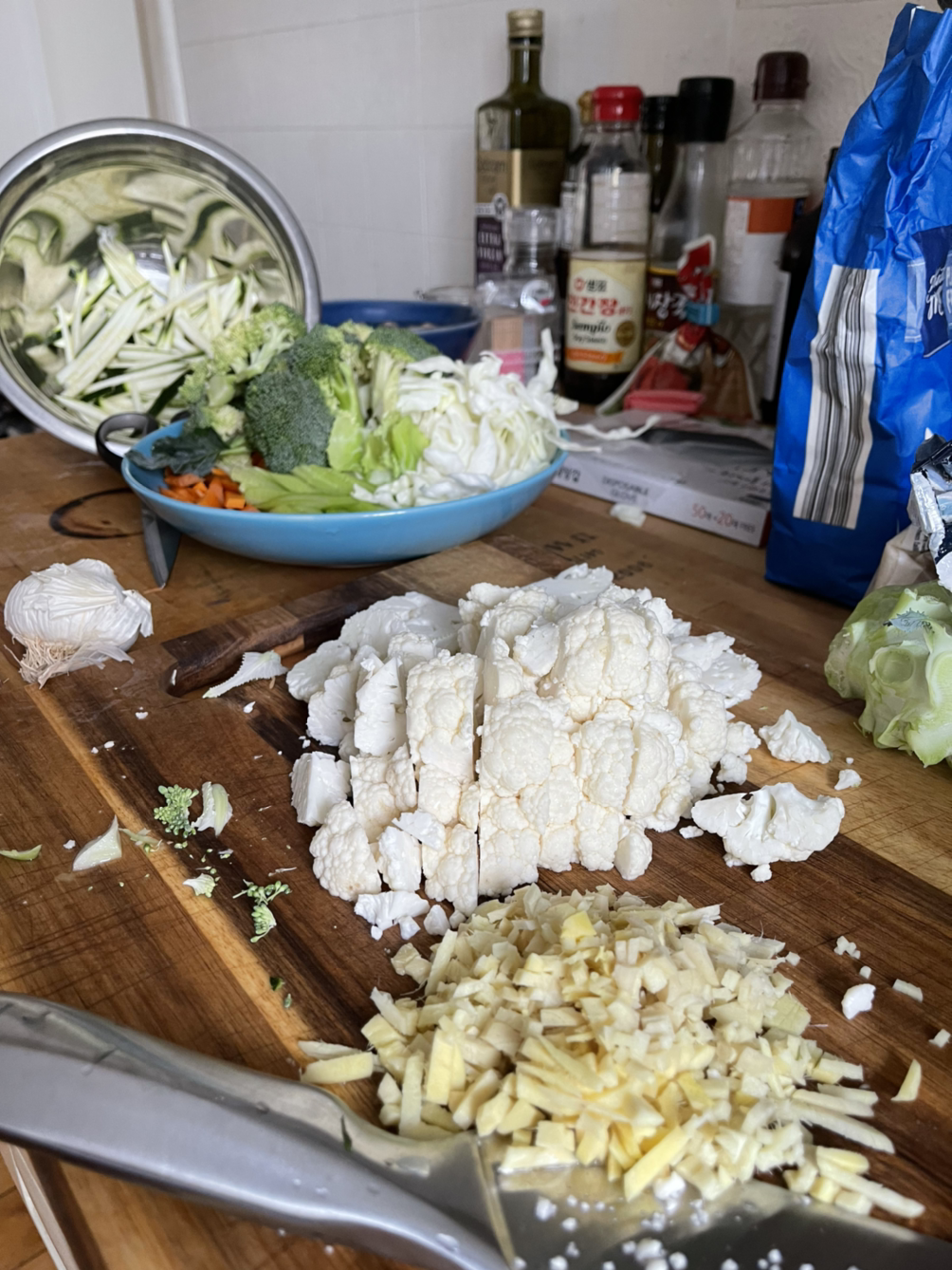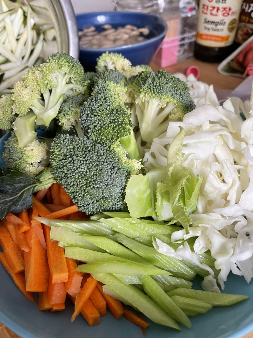 냉장고에 있는 야채를 죄다 꺼내서 씻고 자르기 시작했다.