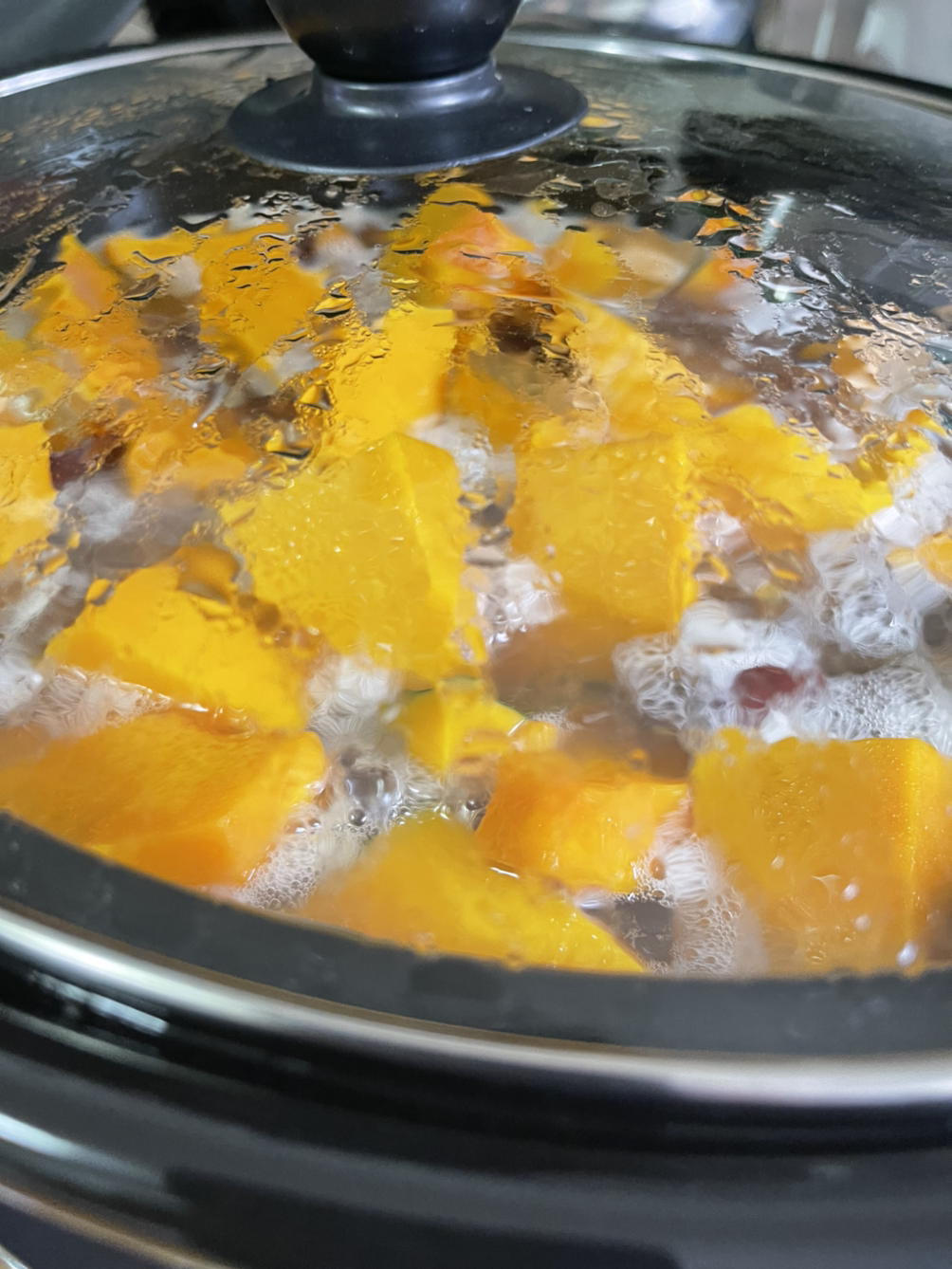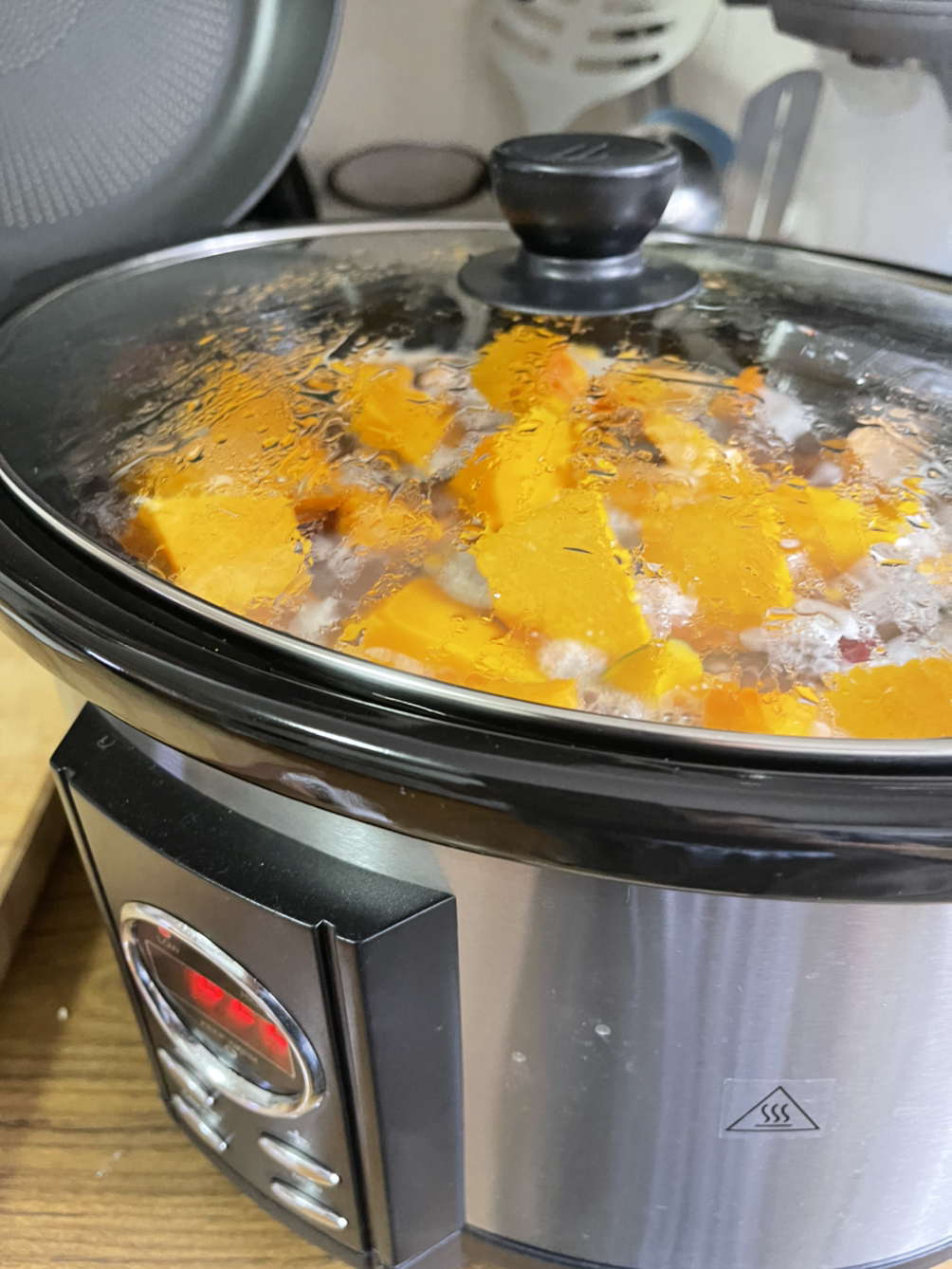 그리고 호박죽을 슬로 쿠커에 넣고 조용히 만들고 있다. 큰 호박 한 개를 사 와서 잘 닦아서 껍질 째 잘라서 넣었다.