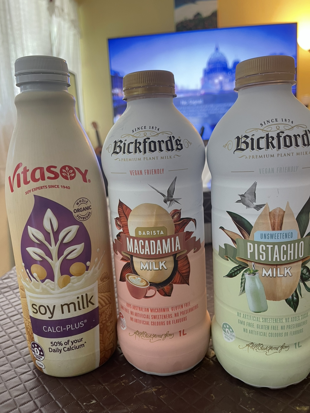 어제 슈퍼에 갔다가 피스타치오로 만든 우유(맨 오른쪽)와 마카데미아로 만든 우유도 샀는데