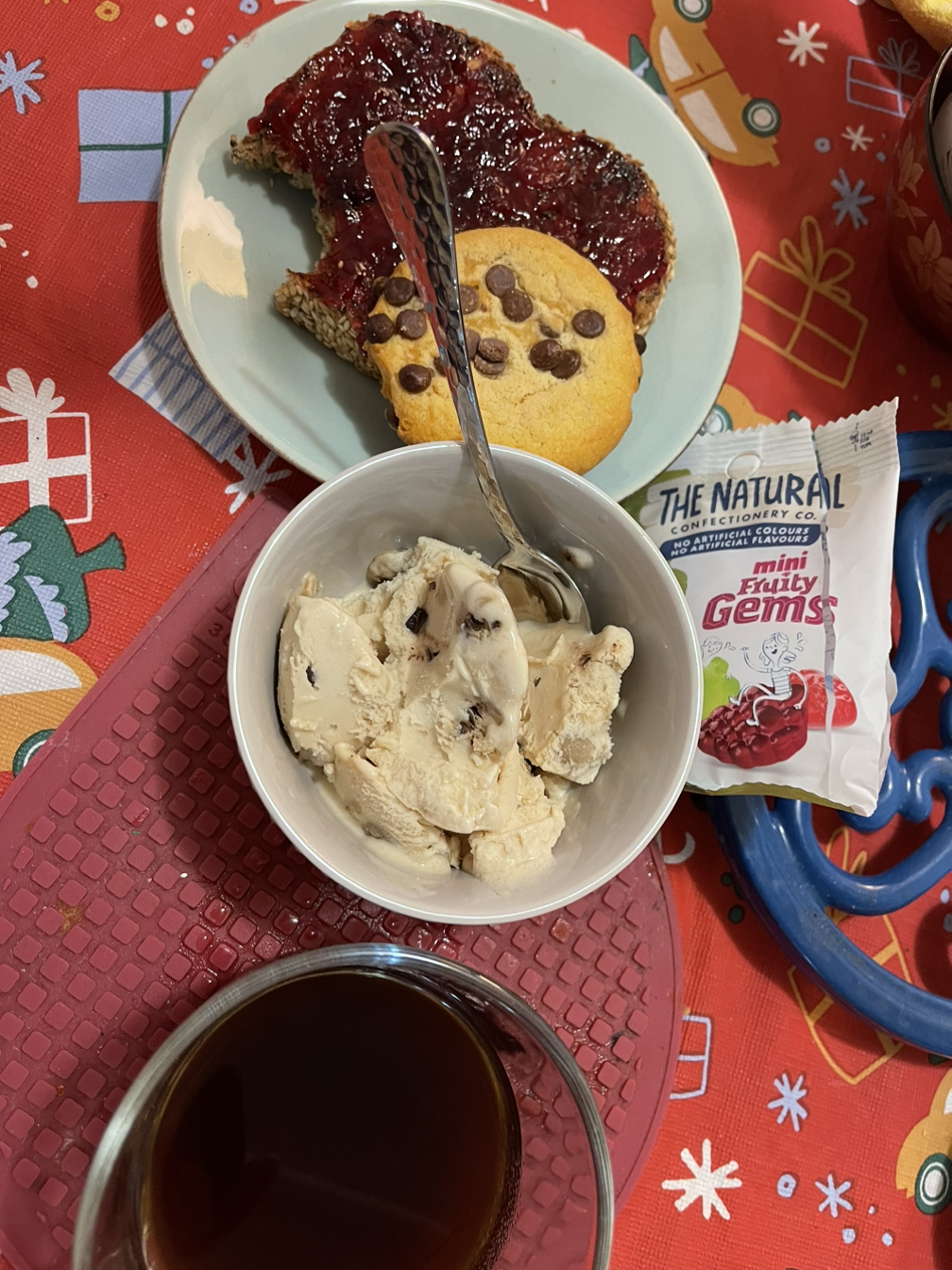 아이스크림을 먹고 초콜릿을 먹고 젤리를 먹으며