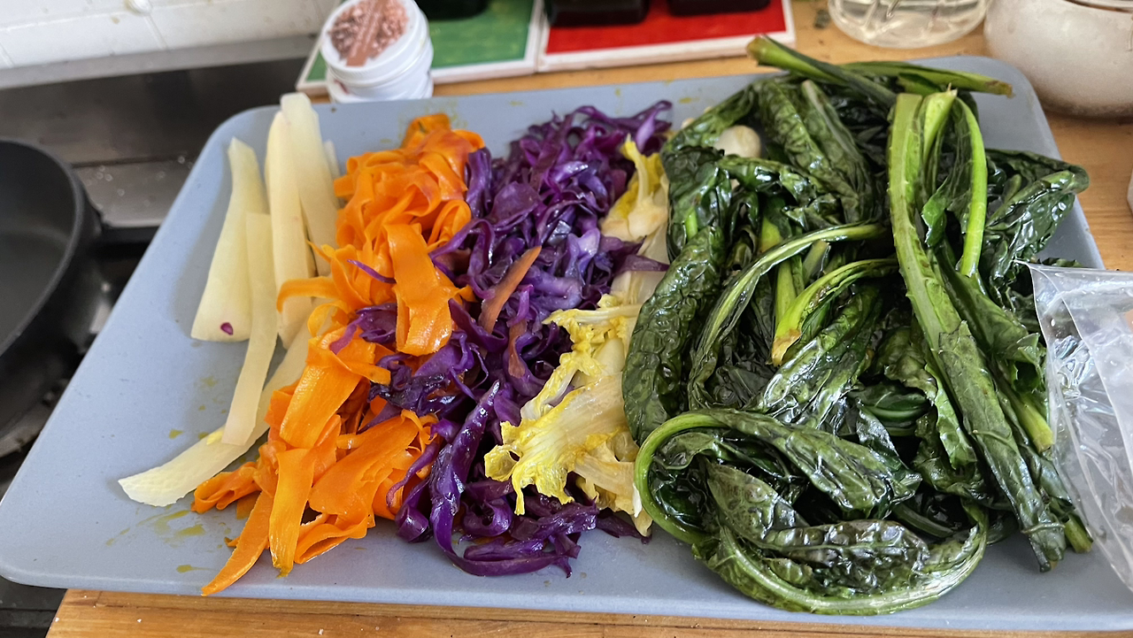 단무지, 당근, 보라색양배추, 배추 볶은 거, 케일