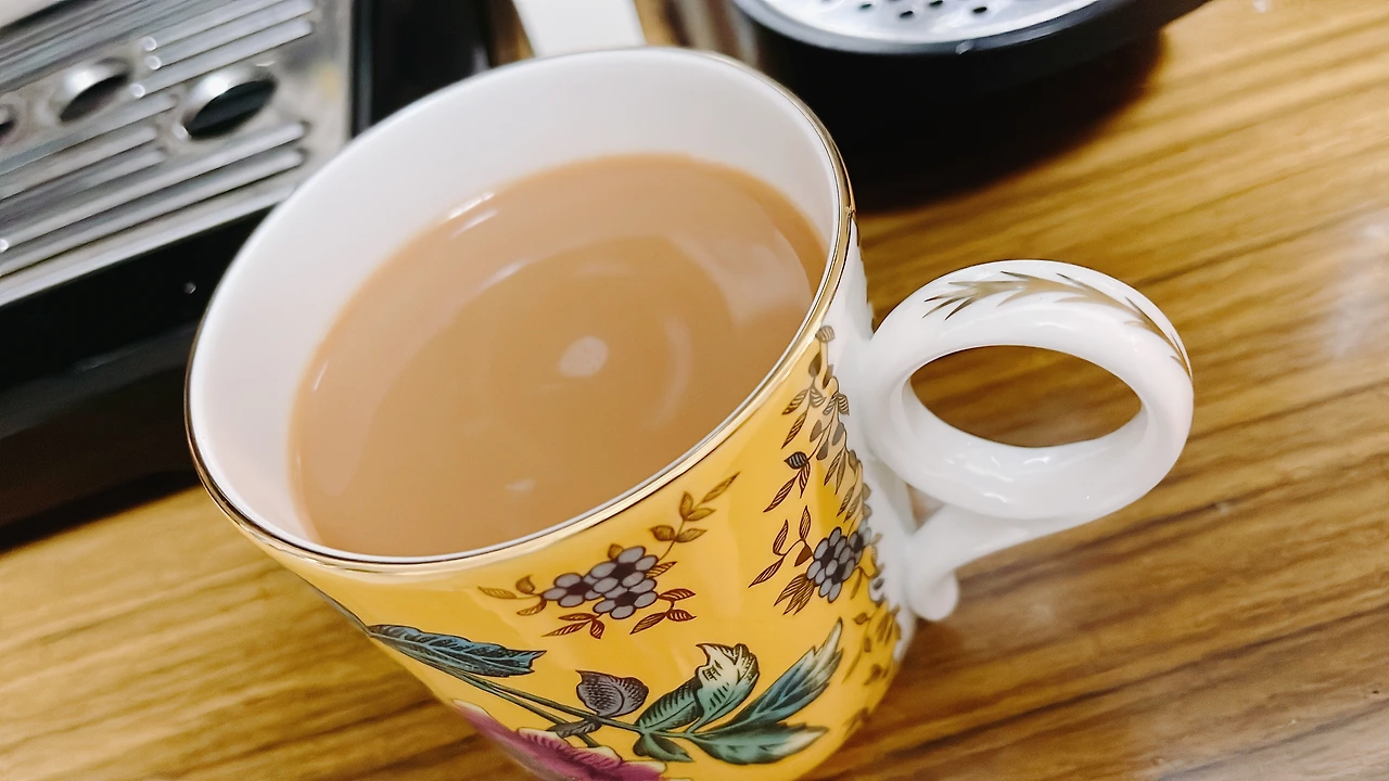 우아한 컵에 있는 따뜻한 홍차를 마시니까 기분이 좋았다.