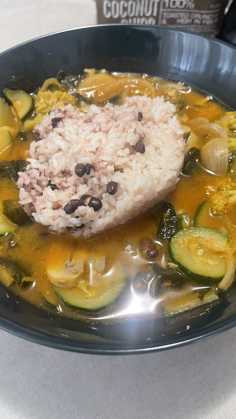 늦은 점심으로 된장고추장국 - 미역, 버섯, 호박, 감자, 브로콜리, 양파를 넣고 끓였다.