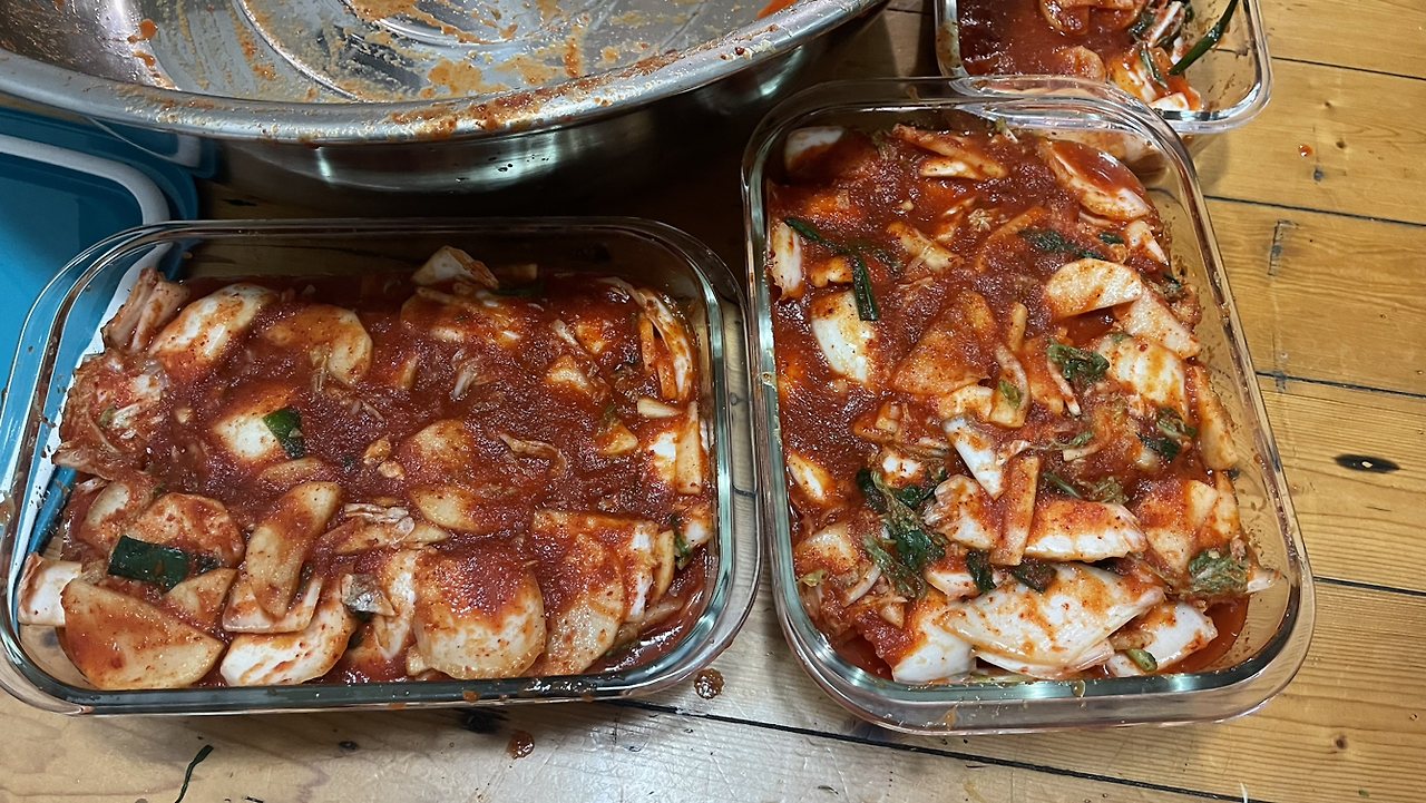 요즘은 김치를 담아서 한식을 많이 먹는다.