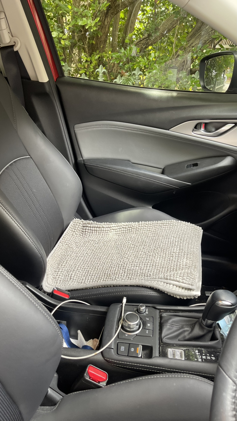 조수석에 소리가 앉아 있던 방석이 보인다.
