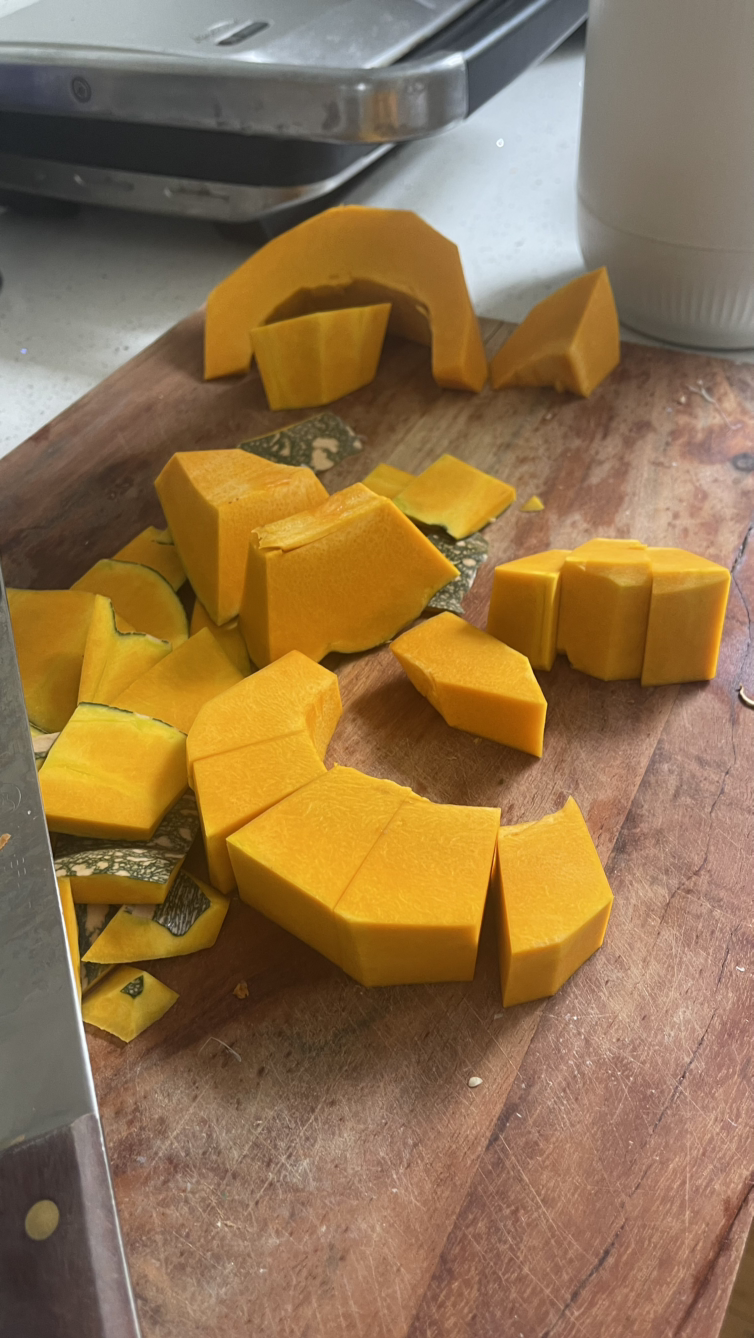 호박을 썰어 호박죽을 만들어 먹고
