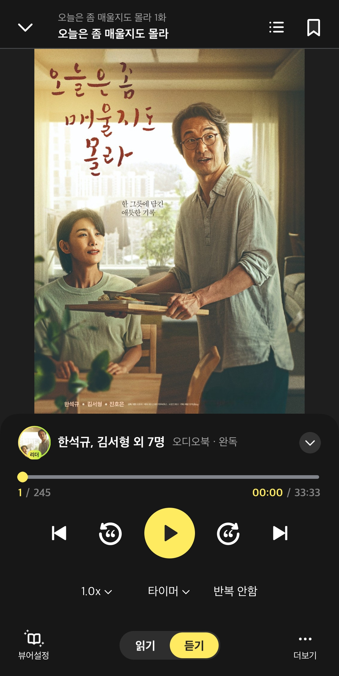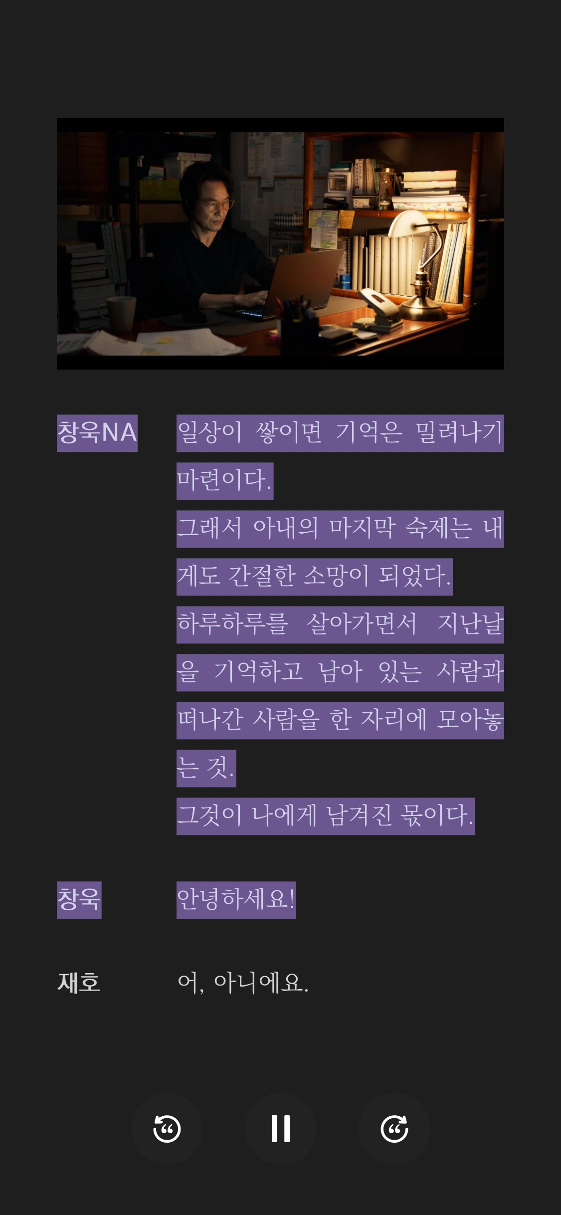 전에 봤던 드라마인데 목소리로 듣는 대사는 더 깊고 아프고 더 따스했다.