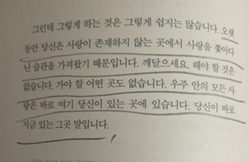 자기 사랑(- 로렌스 크레인 p272)에서 이야기하는 것처럼 자신 안에 있는 사랑을 깨닫지 못하고 사랑을 계속 쫒는 사람들을 보면 스스로 내 안에서 사랑을 찾으라고 말해주고 싶다.