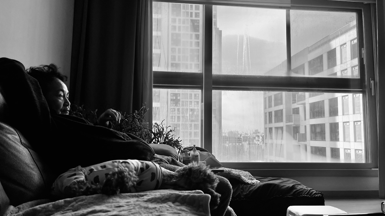눈 오는 오후에 어머니는 티브이를 보시고 어머니의 강아지는 잠이 들었다.