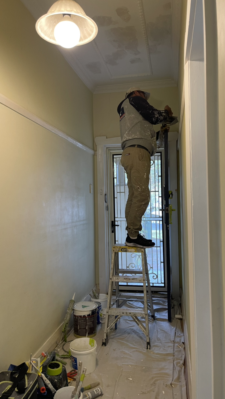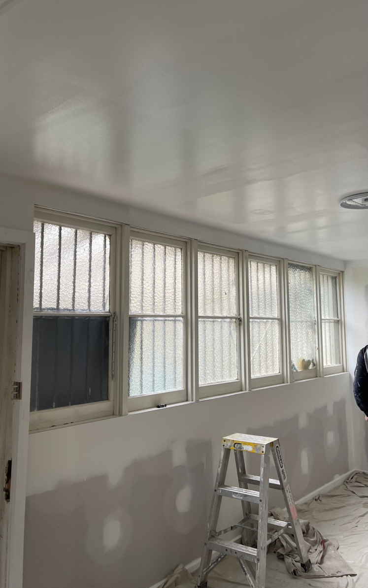 페인트가 묻지 않도록 바닥에 천을 깔고 작업들을 하고 있다.