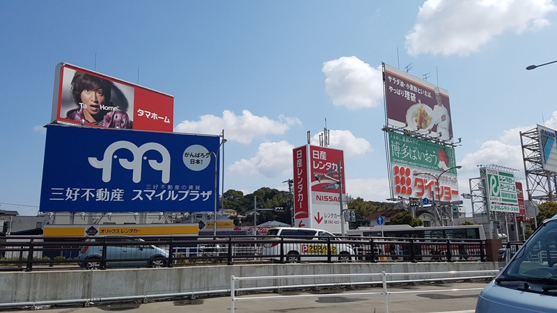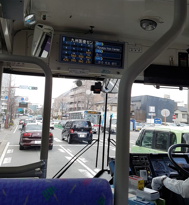 그렇게 버스를 타고 어느 정도를 지나니 하카타 역이 나온다. 버스를 가득 매운 사람들이 여기서 우르르 내린다. 여기가 중심지인가보구나. 다시 버스가 출발할 때는 버스안에 남아있는 사람들이 우리와 몇몇 사람들 밖에 없었다. 갑자기 묘한 썰렁한 기운이 흐른다. 구글 지도를 보면서 제대로 가고있는 건지 확인한다. 버스 앞쪽에 정거장을 알려주는 전광판은 다행이도 한글이 표기가 된다. 일본어 - 영어 - 한국어 순으로 순환되어 표기가 된다. 한국어로 표기가 된다 한들 뭐 잘 모르겠다. 버스의 노선도를 알 수가 없으니 제대로 가고 있는 건지 가늠이 안됐다. 그런데 신호대기를 위해 버스가 서서히 멈추더니 갑자기 시동이 부르르 하고 꺼진다. 어? 이거 뭐지? 잠시뒤 신호가 바뀌자 또 부르르 하더니 시동을 걸고 출발한다. 신호대기뿐만 아니라 차량 정체시에도 차가 멈추면 바로 시동이 꺼진다. 신기하다.