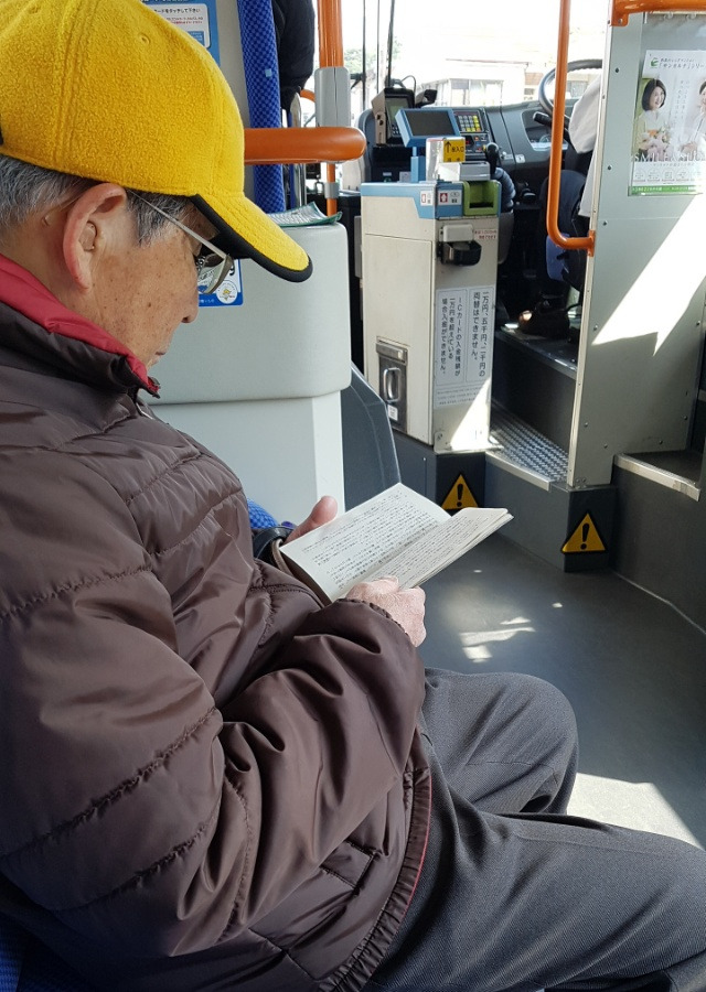 아내와 아이는 뒤쪽 좌석에 앉고 나는 자하철좌석처럼 생긴 좌석에 앉는다. 바로 옆에는 나이가 지극하신 할아버지 한분이 세로로 쓰여진 책을 읽고 계신다. 일본인들이 대중교통이용시 독서하는 비율이 높다고 들은 기억이 떠오른다. 실제로 버스에서 책을 읽는 사람들은 그다지 많이 보진 못했다. 지하철은 어떨지 모르겠다. 꽤 집중해서 읽는 모습이 인상적이였다.
