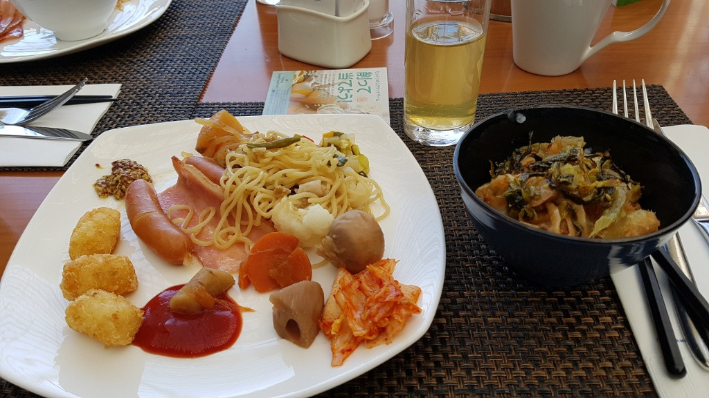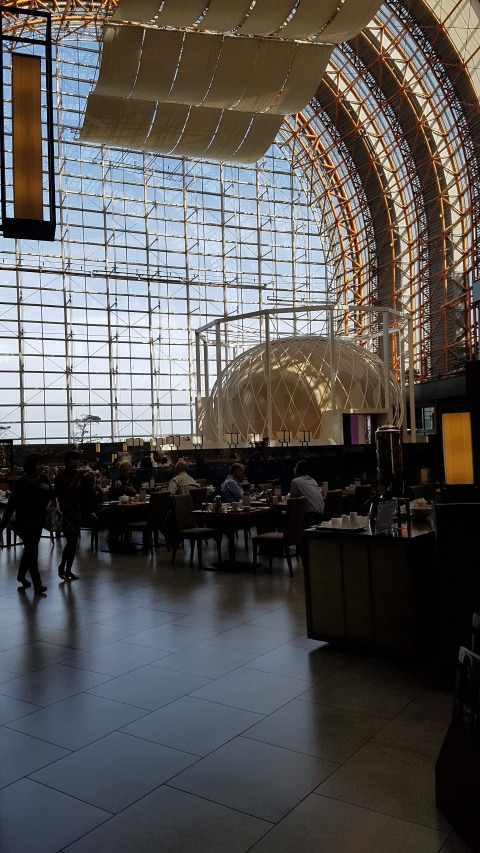 아침을 먹기위해 아내와 아이를 깨운다. 킹 침대가 우리 세식구가 자기엔 충분하다. 서로 크게 불편하지 않다. 간단히 세수를 하고 옷을 입은 뒤 4층으로 내려간다. 조식은 라운지와 조식당 두군데서 먹을 수 있다. 라운지쪽이 4층 조식당보다 가짓수는 적지만 좀 더 조용한 분위기에서 식사를 할 수 있다는 장점이 있다. 우리야 당연히 크고 가짓수 많은 4층이지. 라운지야 어제 내내 질리게 이용해봤으니. 찾아본 정보에 의하면 4층 조식당은 사람들이 많아서 정신이 없다고 들었다. 그래서 어느정도 각오를 하고 갔는데 웬걸. 사람이 별로 없다. 가만보니 우리가 좀 늦게 온 것이였다. 10시가 마감인데 9시쯤 들어갔으니 그럴 수 밖에. 다들 식사를 마쳤겠지. 우리야 급한 일정이 없으니 늦잠자고 천천히 온 것이였다. 조식당은 천장이 꽤 높다. 3층과 4층 정도의 높이쯤 될까. 커다란 통창에 하얀색 철제빔들이 그물처럼 되어있다. 전에 갔던 고급호텔들도 이런 비슷한 구조로 되어 있었다. 공간의 효율성으로 치면 천장이 높은 구조라 비효율적이지만 전체적인 느낌은 고급스런 이미지가 물씬 풍긴다.