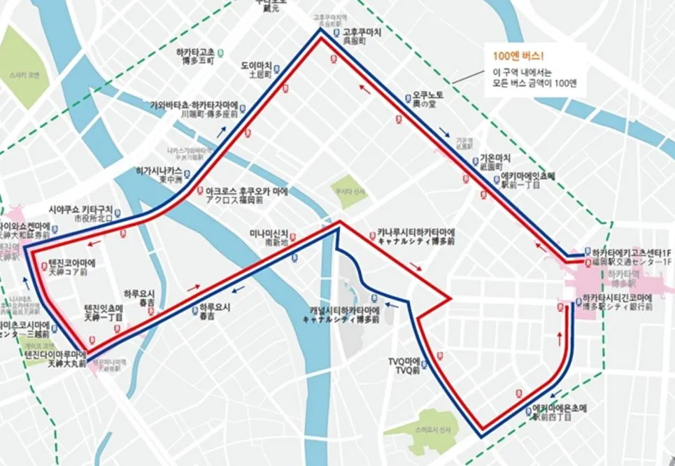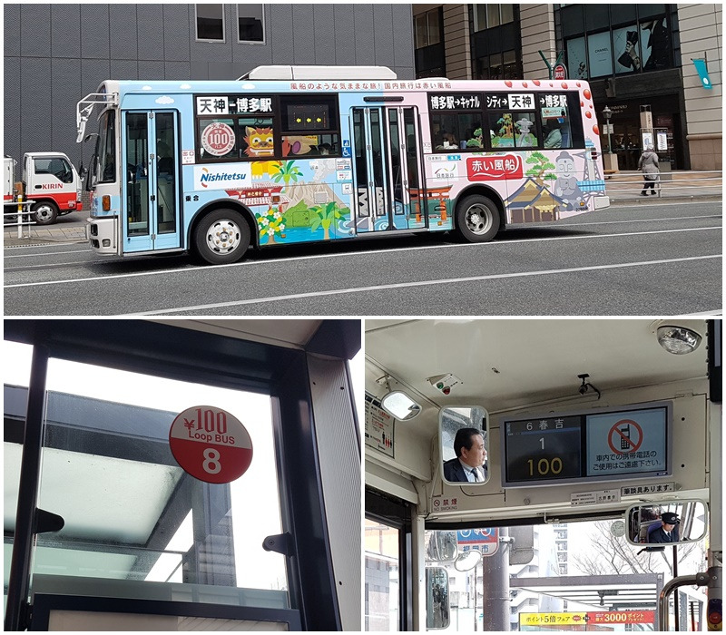 후쿠오카의 주요시내를 순환하는 버스다. 전구간 100엔이다. 앞서 살펴봤던 버스요금을 보여주는 모니터에도 정거장 번호 1과 100엔 표시만 표시되어있다. 후쿠오카의 주요 포인트인 하카타역, 캐널시티, 텐진 같은 곳을 순환하므로 시내관광시 이용하면 효과적이다. 버스의 종류는 정해져 있지 않고 여러가지 모양이 있었다. 어떤 버스에는 100엔이라고 써있는 버스도 있는 반면 그렇지 않은 버스도 있으니 잘 봐야 한다. 좀 아쉬웠던 것은 100엔 버스 정류장이다 라고 표시가 어떤데는 잘 되어있는 반면 그렇지 않은 곳도 있었다. (100엔버스 정류장은 번호가 써있다)