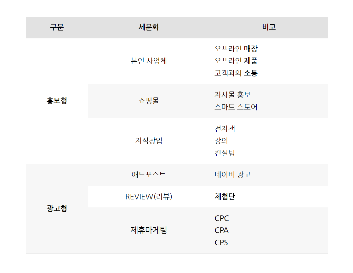그럼 대체적으로 알려진 블로그 수익화 종류를 살펴보겠습니다. 크게 본인의 제품과 서비스를 알리는 홍보형과 타인의 상품을 광고해 주는 광고형으로 나눕니다.