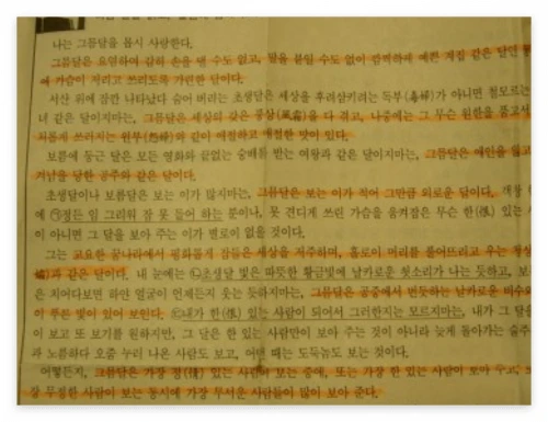 고등학교 때 국어 문제집 지문으로 나온 그믐달을 읽고는 문제를 풀 생각은 안 하고 그 글에 매료되어 책장을 찢어 간직했다.
