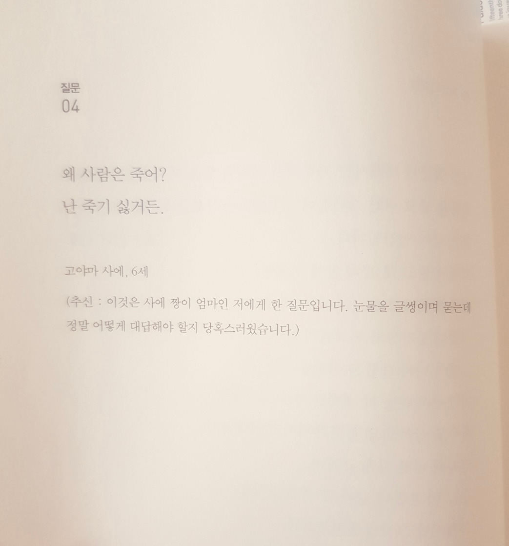 “왜 사람은 죽어? 난 죽기 싫거든”이라는 아이의 질문에 어떻게 대답해 주면 좋을지 묻는 글이었다.