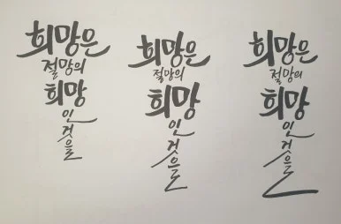 "제가 쓴 글씨라 그럴까요? 어떤 때 보면 아직 맘에 들지 않기에 다른 사람들에게 보여주기가 좀 부끄러워요. 선생님은 본인 글씨가 맘에 드시나요?"