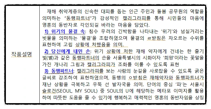 공모전에 도전하려니 주제에 대한 공부가 필요했다. 관공서에서 주최하는 공모전, 내가 가진 강점을 활용할 수 있겠다 싶었다. 공무원 입장에서 볼 때 서울시가 만든 특정 사업을 홍보하면 좋을 것 같다는 생각이 들었고 그래서 선정한 주제로 만들어 낸 글귀.