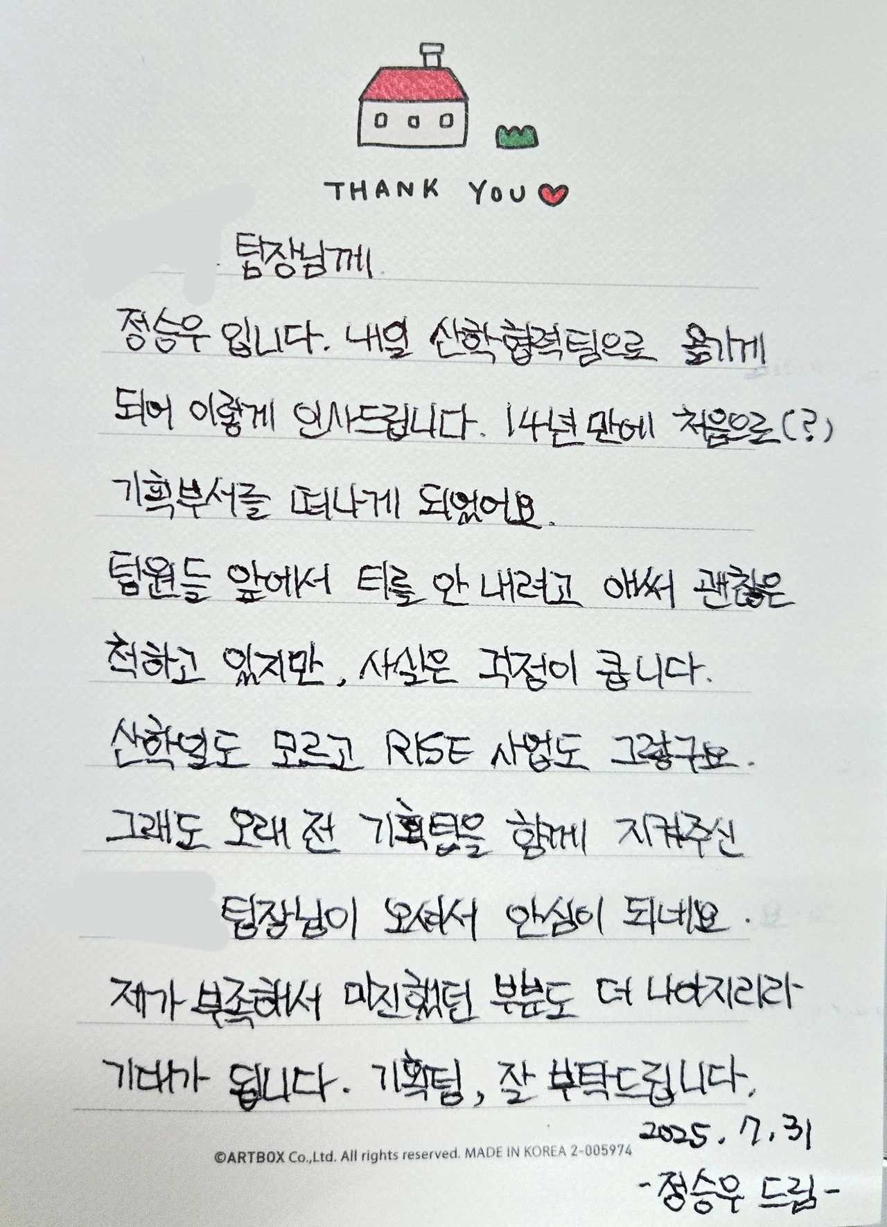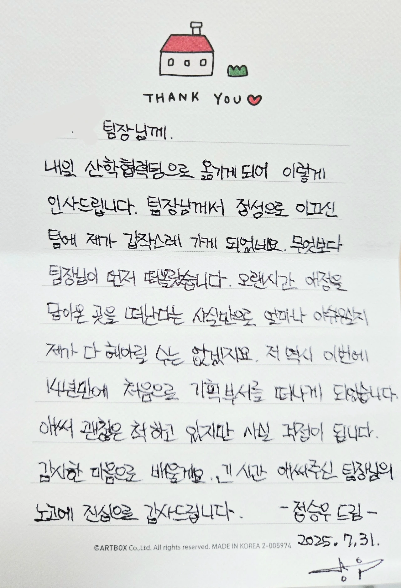 새벽 2시 반에 눈이 떠진다. 잠이 오지 않아서 잠시 있다가 내가 가야 할 부서의 팀장님과, 내가 있는 지금 기획부서로 오게 될 팀장님께 각각 손 편지를 썼다. 두 분 모두 마음이 편하진 않을 것 같았다. 가는 분은 나처럼 아쉬움이 있고 오는 분은 와서 잘할 수 있을지 걱정도 있을테니. 어색하게 있기보단 하루 전인 오늘 가서 편지를 전하고 간단히 간식이라도 선물하기로 했다.