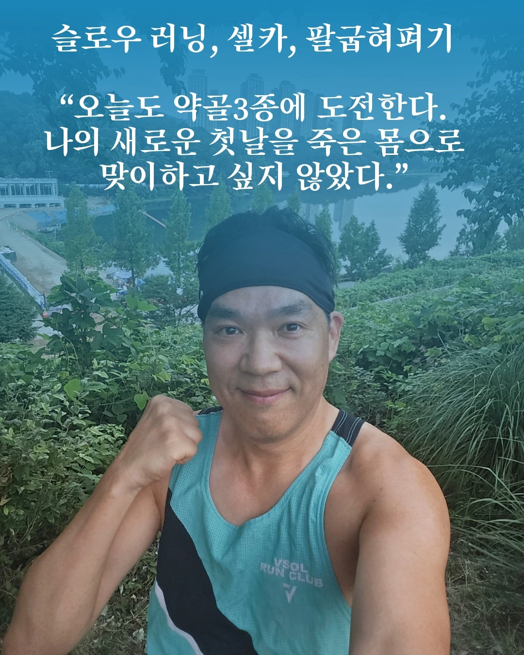 찰칵! 셀카를 찍는다. 혼자 뛰다가 사진 찍느라 지각할 뻔했던 초보러너 시절이 생각나서 웃음이 난다. 오늘 새로운 부서로 출근하는 첫날. 몸은 찌뿌둥하고 정말 일어나기 싫어도 억지로 뛰러 나왔다. 나의 새로운 첫날을 죽은 몸으로 맞이하고 싶지 않았다.