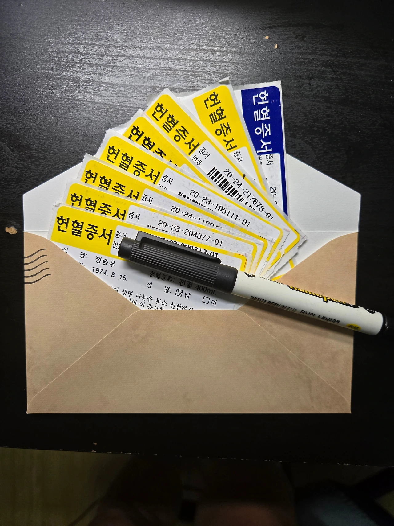 어제 아버지가 편찮으시다는 글을 단톡방에서 보았다. 2022년 3월부터 모은 8장의 헌혈증을 모두 드렸다. 주삿바늘이 무서워 늘 피해왔던 내가 왜 40대에 뒤늦게 헌혈을 시작했을까?