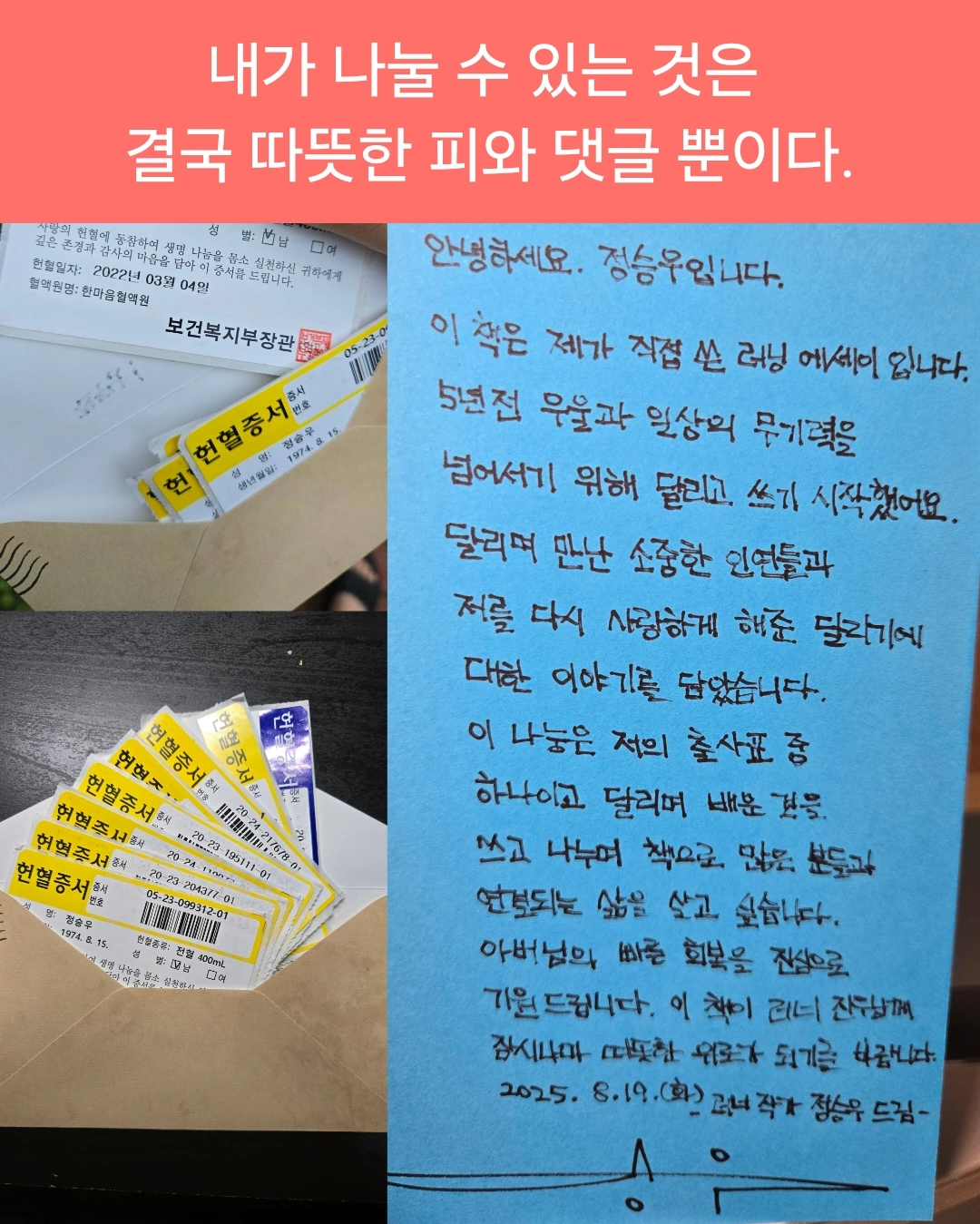 오늘 진우 님께 헌혈증을 드리면서 러너인 그에게 내가 쓴 책 '모든 달리기에는 이야기가 있다'를 함께 건넸다. 누군가에게 내가 쓴 책을 선물할 수 있어서 기뻤다. 베스트셀러가 되고 이름이 알려지는 것이 예전의 목표였다면, 오늘부터는 이런 마음으로 쓰기로 했다. 누군가를 살리는데 내 책이 쓰일 수 있도록, 더 많은 사람에게 닿을 수 있도록 글을 쓰겠다고.