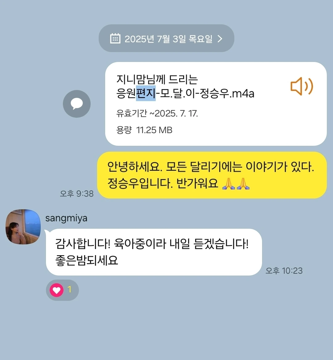 한 달 전 자녀가 희귀 질환으로 힘들어하는 스친을 알게 되었다. 그가 달리기로 이겨내고 있는 모습에 내 책을 선물하고 음성편지로 응원을 전했다. 생각지 않게 한 달 뒤 책을 다 읽고 다른 세 분께 책을 선물하는 따뜻한 선물을 받았다.