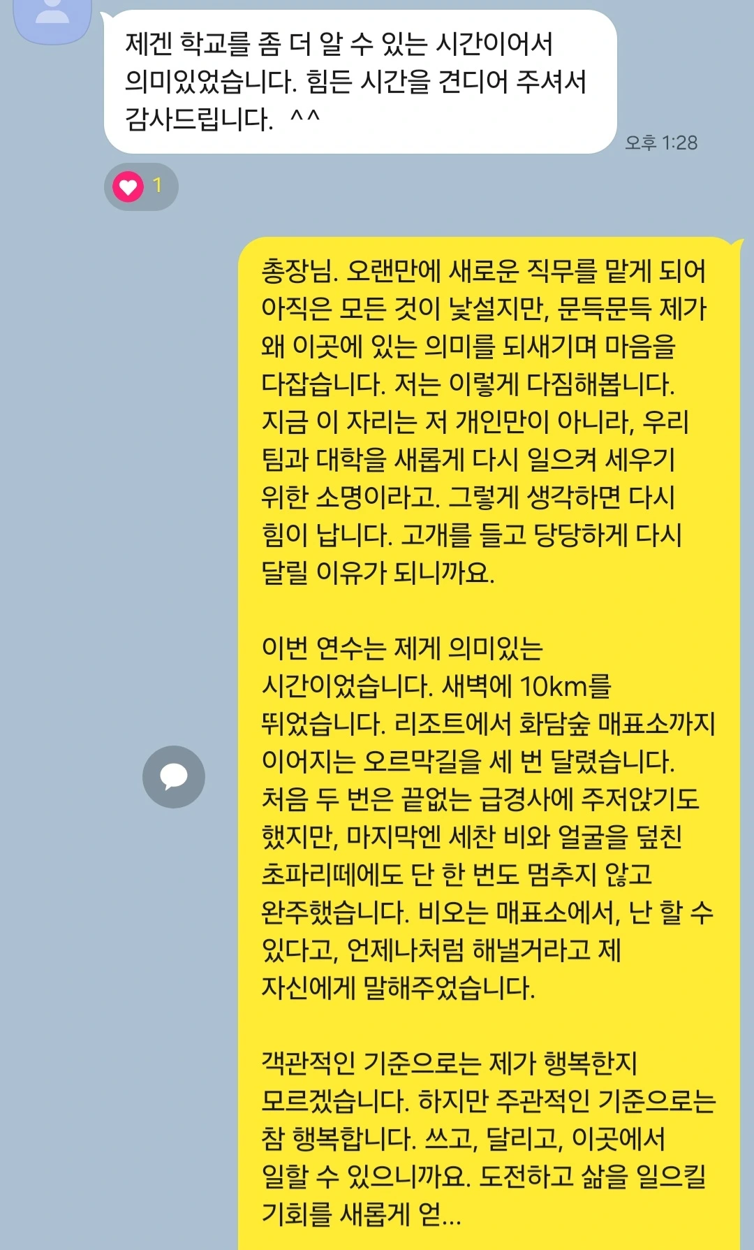 어제오늘 1박 2일로 보직자 워크숍이 있었다. 워크숍 중간 미디어아트 때 사진을 찍다가 총장님도 찍어드렸다. 카톡으로 사진을 보내드리고 감사인사를 전했다. 부서이동 후 1달 된 소회와 힘들 때마다 내가 다짐하는 생각에 대해, 오늘 새벽 비를 맞으며 긴 오르막길을 달리며 결국 세 번만에 쉬지 않고 끝까지 완주한 이야기까지.