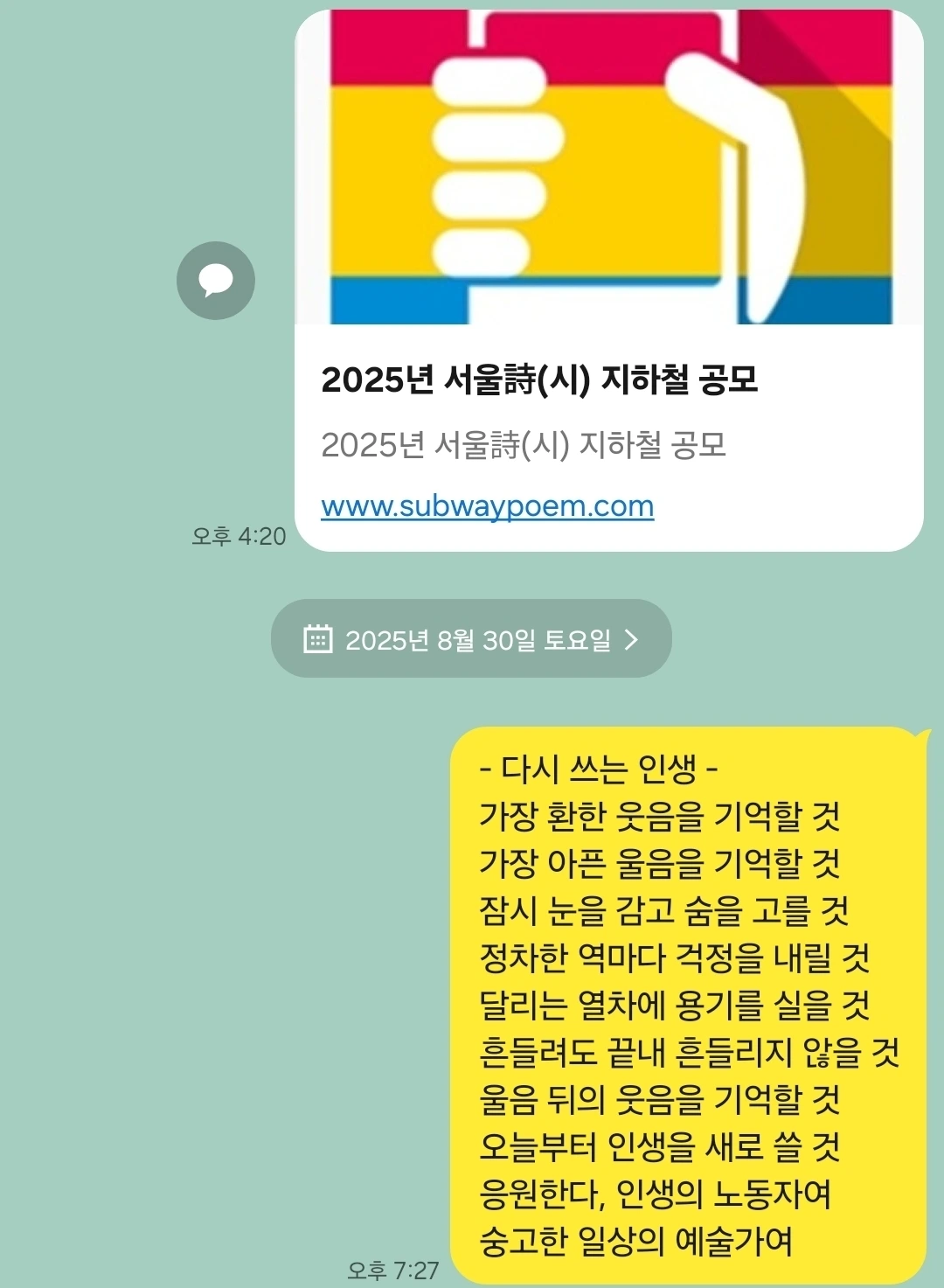 스레드에서 우연히 서울 지하철 문에 붙일 시 응모 공모를 보고 흥미가 생겼다. 시 하나를 써서 응모했다. 되면 기쁘고 안돼도 도전한 자체로 나는 성장하니까.
