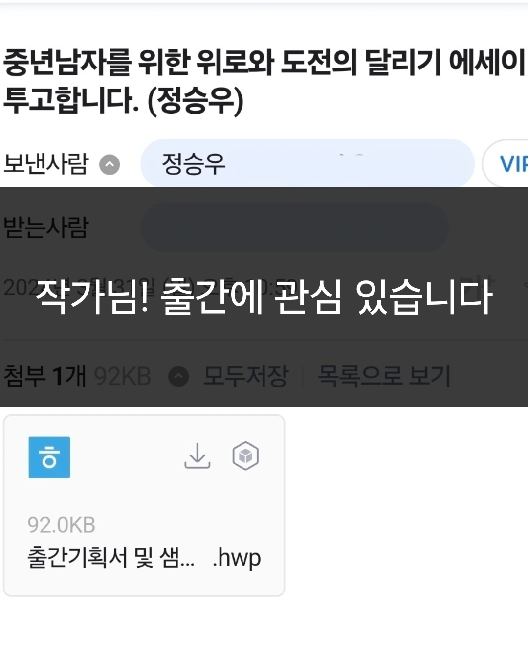 2024년 4월 1일 (월) 오전. "안녕하세요, 정승우 작가님. C출판사입니다. 저희에게 원고를 보내주셔서 감사드립니다 :) 달리기를 통해 새로운 삶을 발견하고 제2의 삶을 살아가는 작가님의 이야기는 많은 독자의 가슴을 울릴 것입니다! 특히 '2010 한일 나의 친구, 나의 이웃을 소개합니다', '2022 춘천마라톤 우수 후기 부분'에 글이 선정된 작가님의 필력에 원고가 더욱 기대됩니다.
