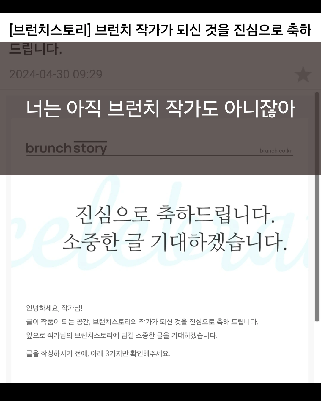 출근 후 가만히 메일을 열었다. 1157일 만에 브런치 작가 승인이 떨어졌다. 4수 만에 처음 만나는 합격 메일이 와있었다. 글쓰기 플랫폼 '브런치'에 가입 후 7년 만에 작가 신청에 도전한 지 3년 만에 글 쓸 수 있는 기회를 얻었다. 2024년 4월 30일 드디어 브런치에 합격했다. 기쁘고 기쁜 날이다. 떨리고 벅찬 마음에 행복했다.
