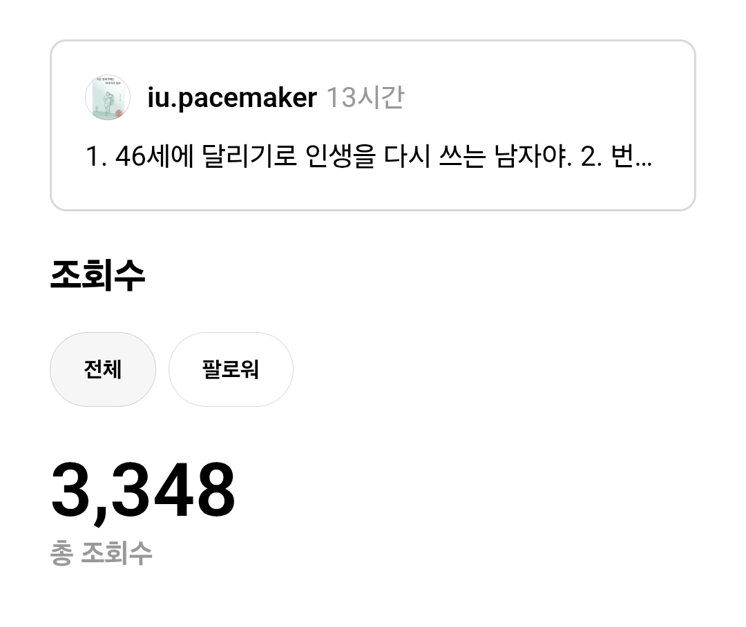 알람이 울렸다. 조회수 3,348회. 새로 팔로우한 33명. 짧은 글이 이렇게 많은 사람의 마음에 닿을 줄 몰랐다. 긴 글만 고집하던 내게, 짧아도 진심이 있으면 충분하다는 걸 알게 해준 순간이다.