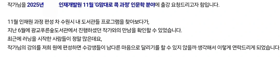 소식을 읽고 강사로 모시고 싶다고 했다.