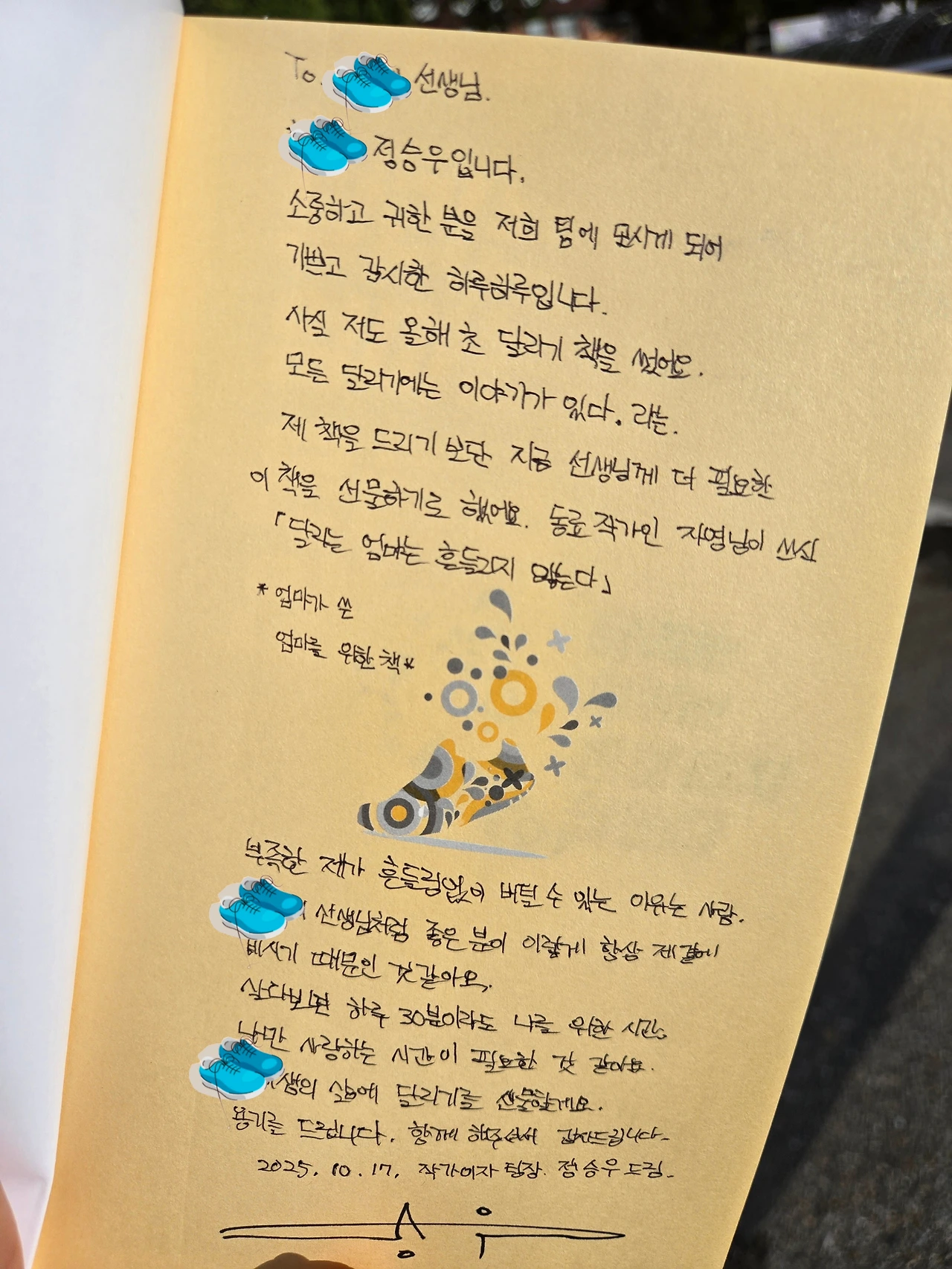 제 책을 드릴까 하다가 선생님 마음에 더 가까이 닿을 책을 선물하기로 했어요. 자영 작가님이 쓴 '달리는 엄마는 흔들리지 않는다.' 예요.