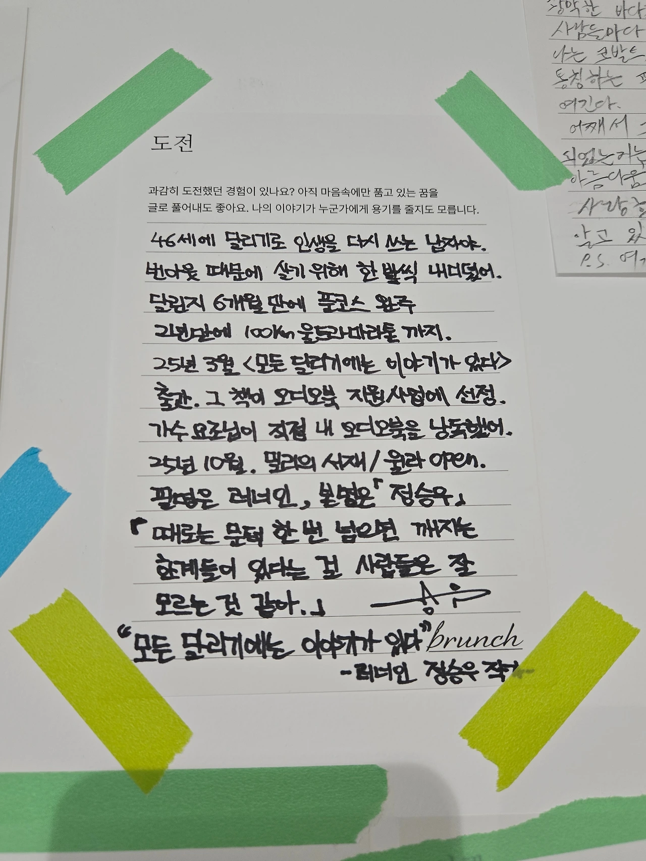 그 인연 후 4개월 만에 브런치 10주년 전시회가 열린다는 소식이 들렸다. 작가 100명의 글을 뽑아서 전시한다는 이야기도. 브런치 목 따러 왔다가 4수 만에 겨우 들어온 나도 가슴이 뜨거워졌다. 마침 첫 브런치북을 쓰고 있어서 4수생의 반란을 꿈꿨다.