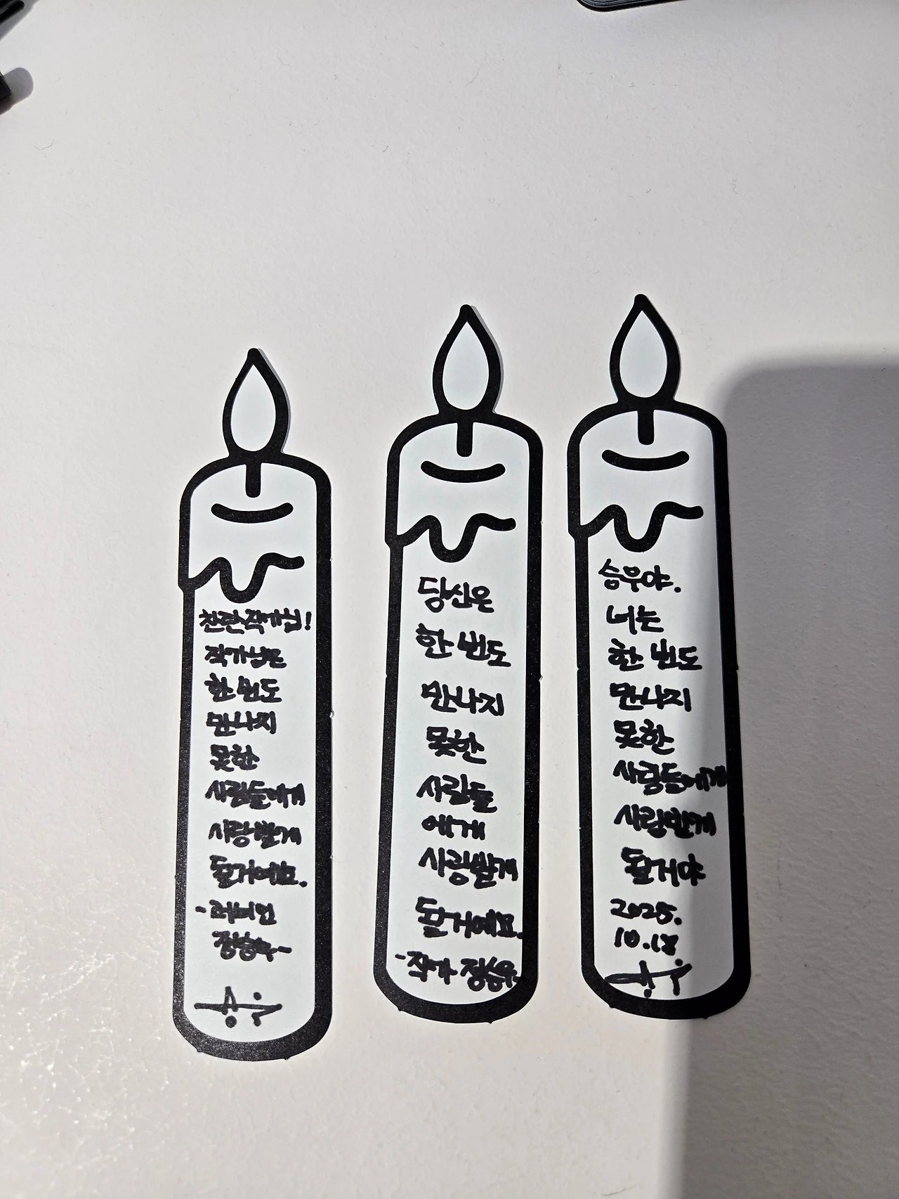 찬란 작가님을 만났다. 인사를 나누고 첫 글에 적었던 스레드와 sns를 통해 서로를 댓글로 만났던 이야기 꽃을 피웠다. 어렵게 만난 작가님 사인을 받고 싶었다. 아까 준비한 촛불 스티커와 책갈피를 선물하고 빈 촛불 스티커를 내밀었다. 그 위에 찬란 작가님의 글과 사인을 부탁드렸다.
