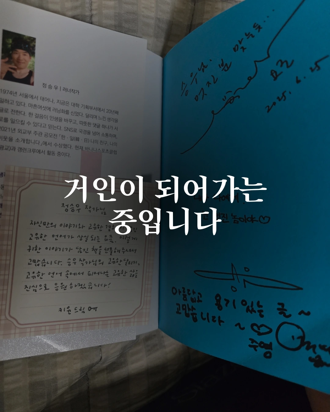 홀로서기는 둘이 만나 홀로 서는 게 아니라 홀로 선 둘이가 만나는 것이다. 출간 후 맨바닥에서 홍보를 하고 무작정 세상 여기저기 문을 두드리고 나를 세상에 보이며 배웠다. 거인의 어깨에 올라타려고 애쓰는 게 답이 아니라 내가 거인이 되어야 한다는 것을. 호랑이의 껍데기를 뒤집어쓰고 행세하는 여우는 되지 말아야 한다는 것을. 영향력 있는 누군가에게 떡고물이라도 떨어지지 않을까 억지 미소를 짓는 내가 아니라, 2,000명이라도 나를 믿고 함께 해주시는 분들에게 도전을 멈추지 않는 뜨거운 삶으로 용기를 주는 나, 러너인 작가 정승우가 되기로 했다.