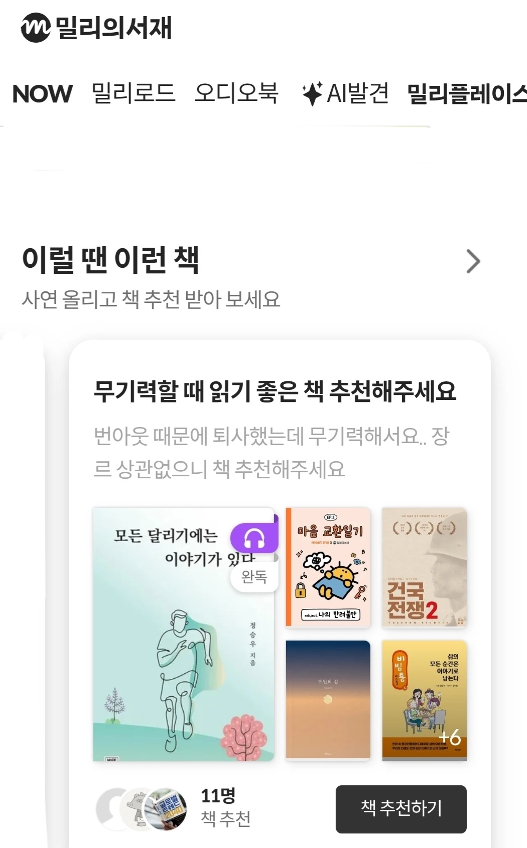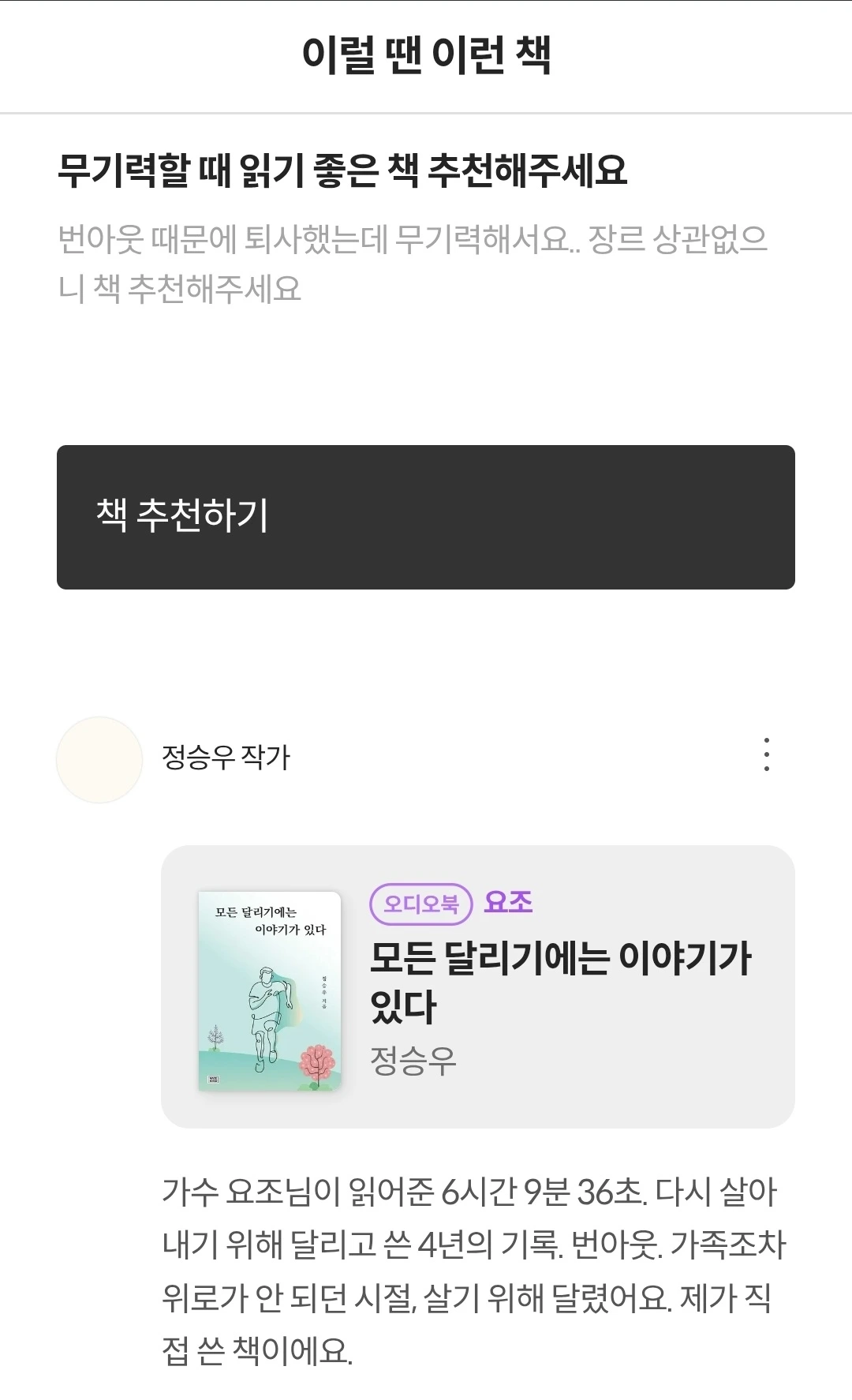 방금 밀리의 서재에서 내가 내 책을 추천했다.번아웃에 도움이 되는 책을추천해 달라는 분께 댓글을 썼다."가수 요조 님이 전하는 6시간 9분 36초번아웃. 가족조차 위로가 안되던 시절다시 살아내기 위해 달리고 쓴 4년. 제가 살기 위해 직접 쓴 책이에요."나태한 삶에서 달리는 삶으로.남이 문 열어주길 바라던 삶에서내가 문 열고 부딪히는 삶으로.진심엔 핑계가 필요 없다.인생에 핑계를 대지 말자.