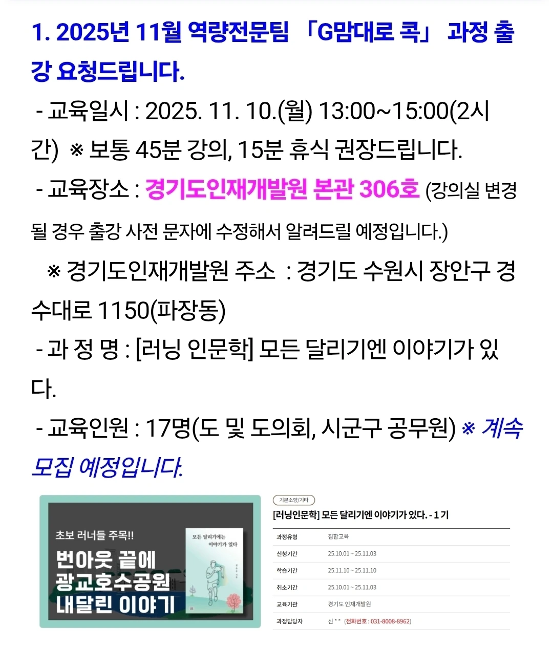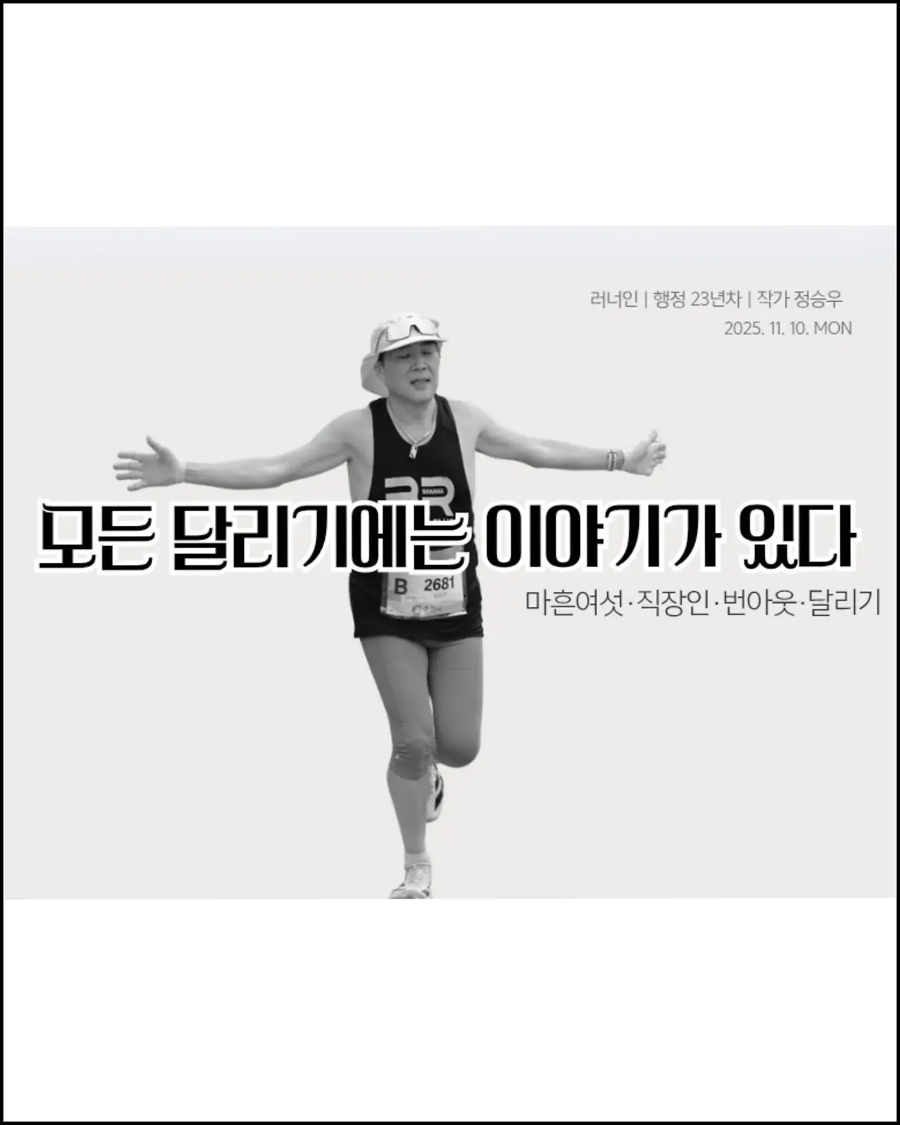 누군가 말하더군요.공무원 대상 강의는 반응도 없고호응도 없을 거라고요.그래도 괜찮습니다.달리기 전의 저는누구보다 영혼 없이 살았던 사람이니까요.늘 누군가를 돌보느라지쳐 있는 당신 앞에 섭니다.영혼 없이 살던 제가달리기로 어떻게다시 나를 사랑하게 되었는지그 이야기를 전하러 갑니다.50시간 뒤,무표정한 당신의 가슴이어느 때보다 뜨겁게 뛰기를 바랍니다.저는 준비되어 있습니다♡